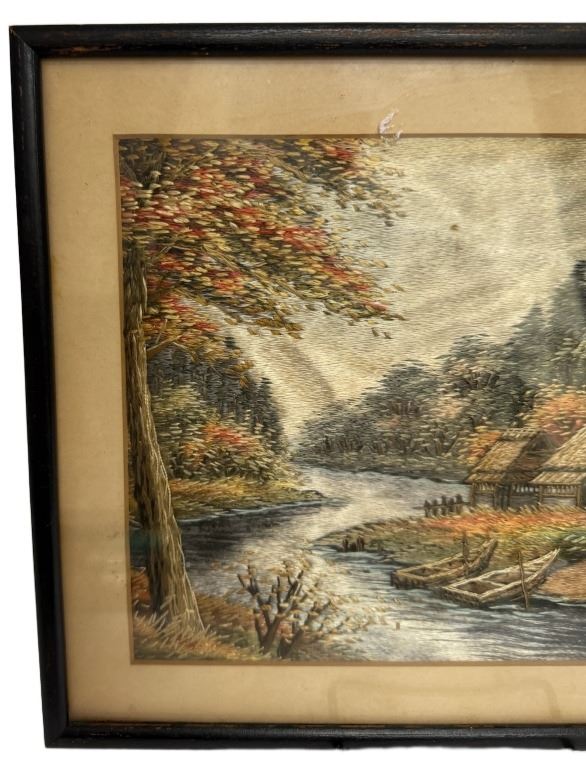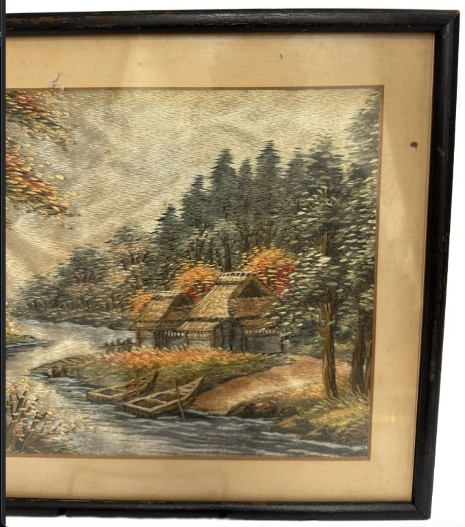 Item/Description: A mixed media landscape depicting a riverside with cottages, trees, and boats, composed of split and dyed straw arranged to create tonal shading. Mounted and glazed in a black-painted frame.