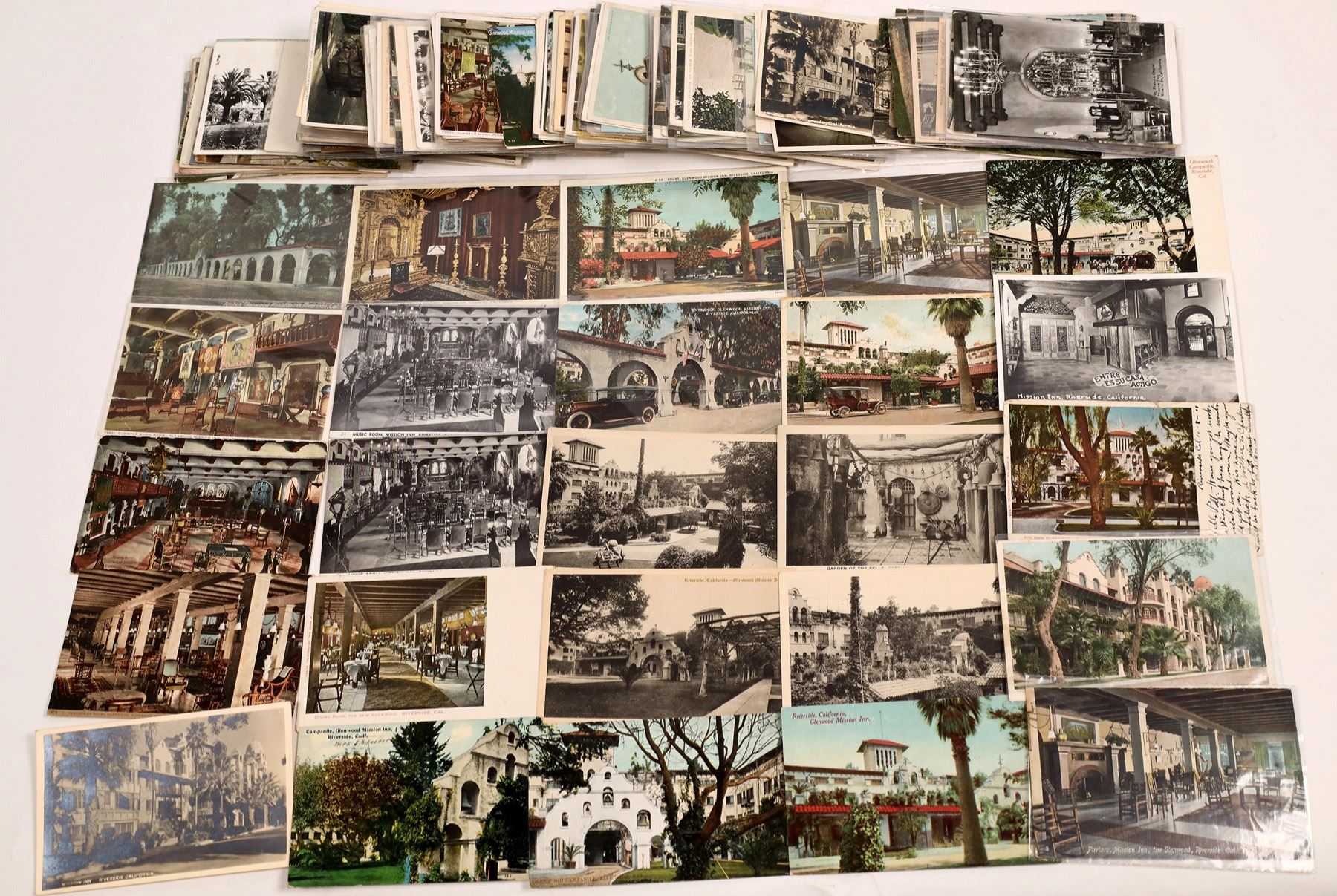 Lot Approx.180. Imprinted logo’s: Newman Post cards, “P-N-C”, Paul C. Kosher ‘P.C.K.”, The American Co., Hecht’s Quality Cards, Glenwood Mission Inn, Color, B/W, some RPC’s, some w/white borders.. Forty one postmarked 1904-57 : Riverside, Pasadena dena, Sacra., Portland, Morrisonville WIS.. Three Souvenir Post Cards w/imprinted mission. Interior/exteriors, gardens, dining rooms, Mission from serial angles, Birdseye. City: State:California Date: