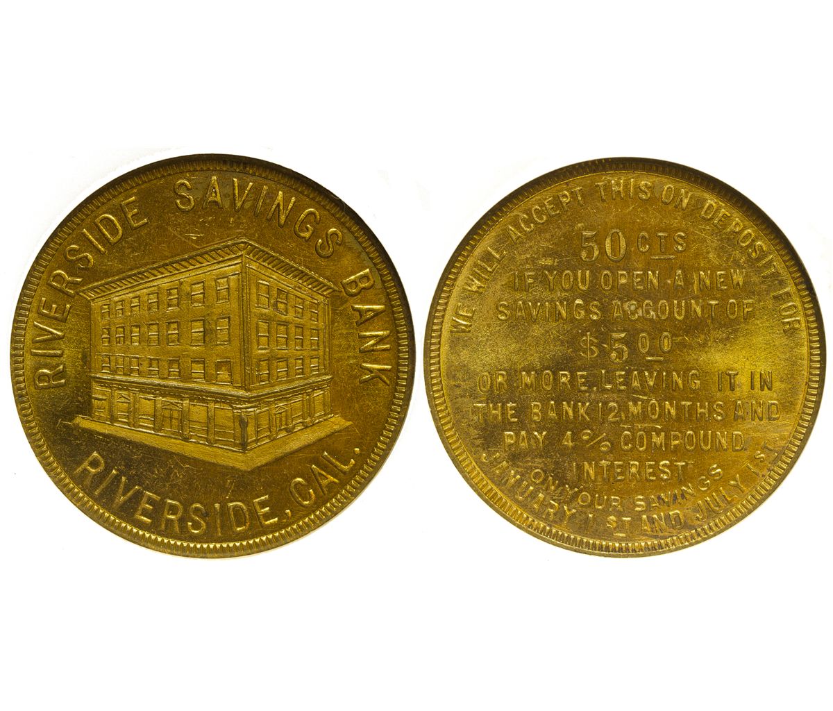 This piece from Riverside savings Bank will pay you 50 cents if you open a new account and leave a minimum of $5 in the account for 12 months. Piece is in very good to excellent condition. -25410