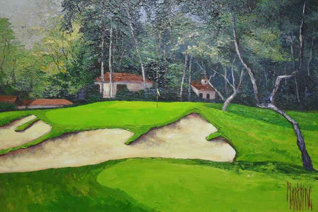 Long a favorite on the PGA Tour, Riviera Country Club in Pacific Palisades, California has been challenging professional golfers and club members for decades.Mark King chose his favorite hole #16 for it's tranquility. Golfers have often enjoyed playing 16 as it gives them a bit of a breather before hitting the very difficult #17-18th finish.Full of texture and true to live colors Mark King's "Riviera #16" is a must for anyone who has played it.Original Acrylic on Canvas size 30x40".Sale includes a Mark King HARDBOUND EDITION coffee-table BOOK.