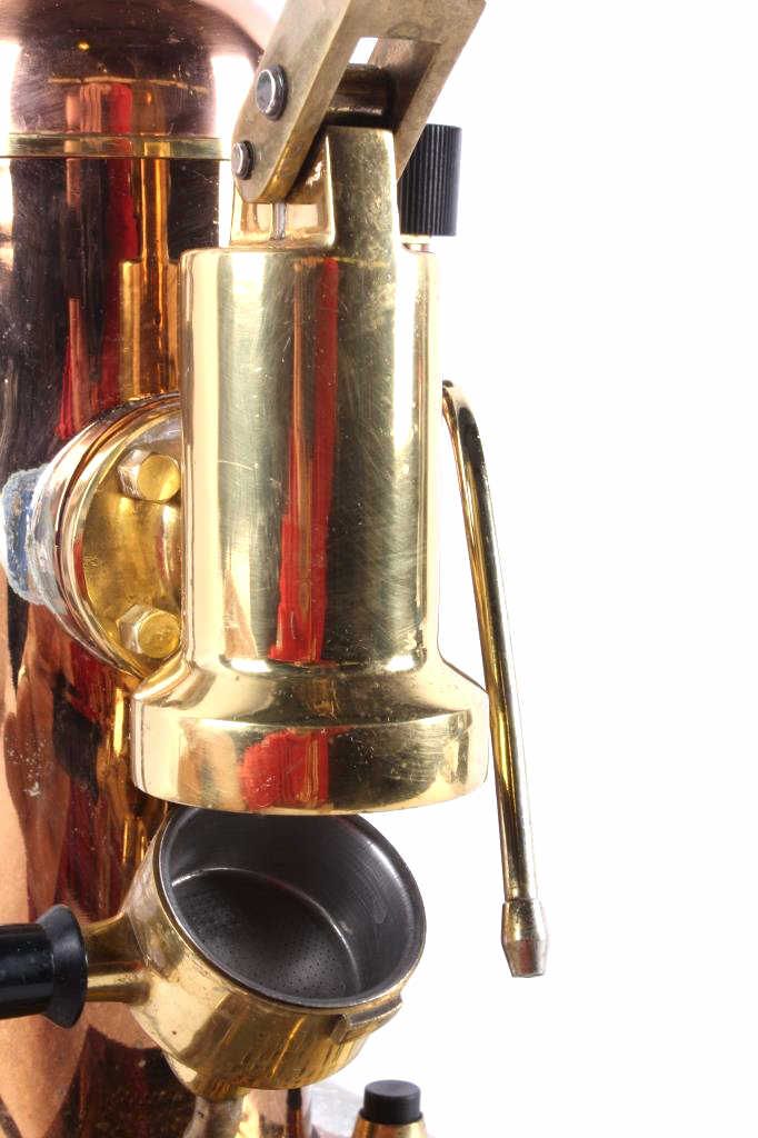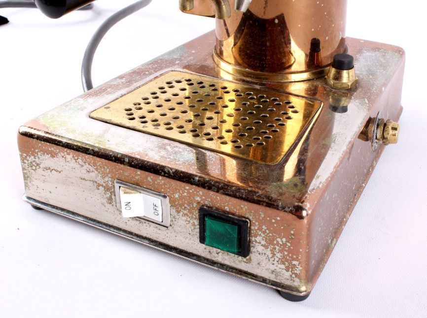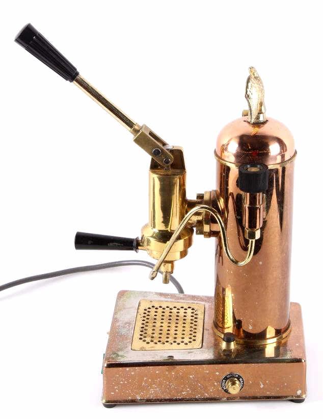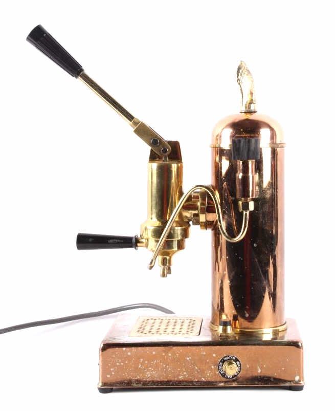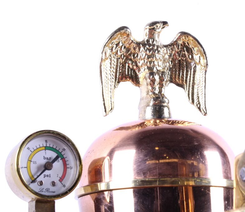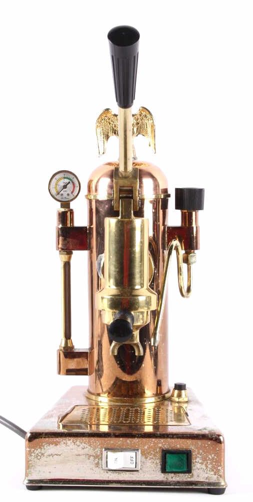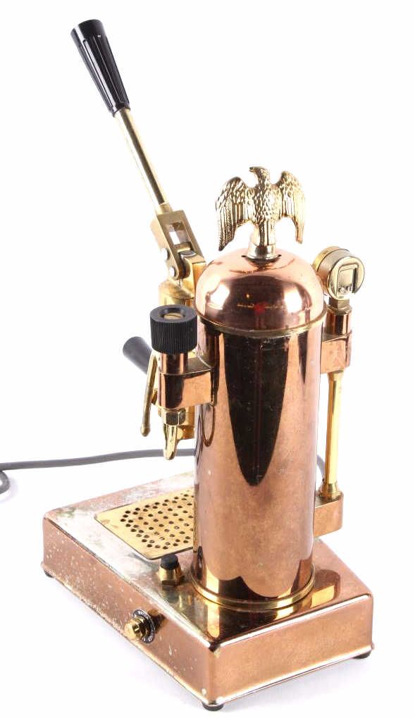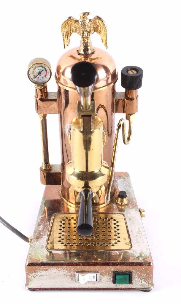 This is an original Mid Century Riviera Eagle Espresso Cappuccino Machine. This machine shows a solid copper, washed copper, and brass construction in overall good condition. The piece does work and is believed to have all the necessary parts. The bottom area has lost some of the copper wash. Elektra SRL RSVP. One of the best Espresso Machines of its time. Measures 8.5"x10.5"x18.75"