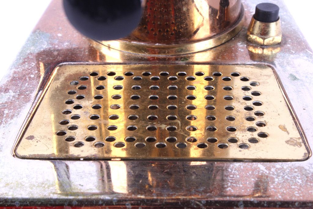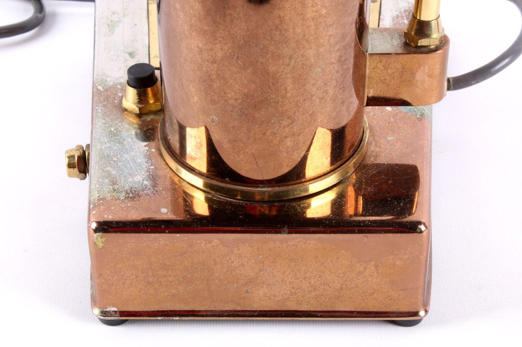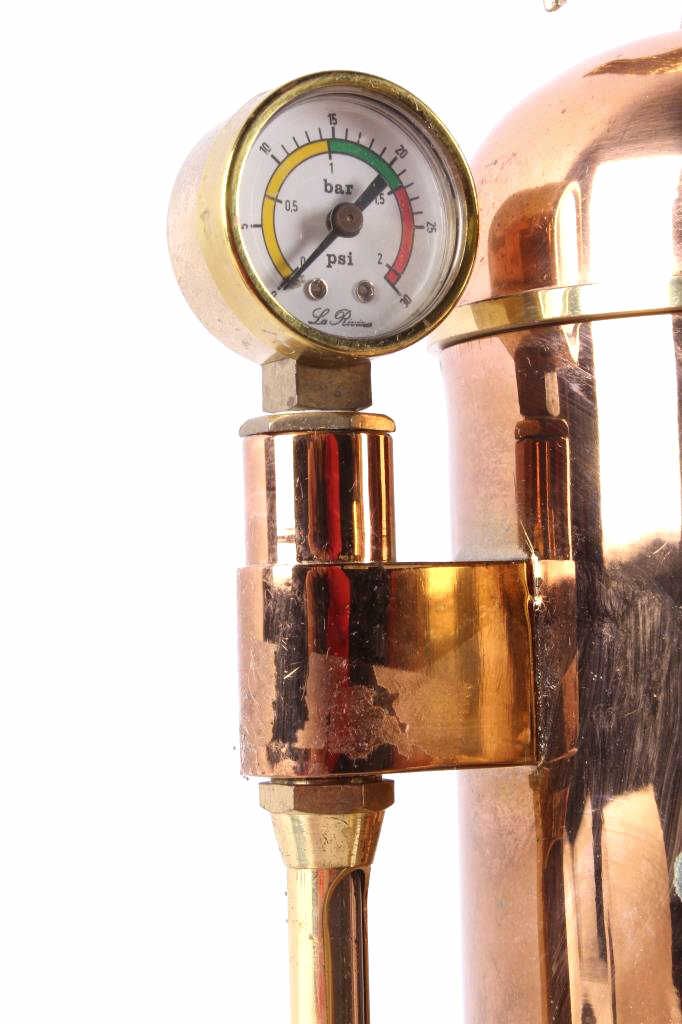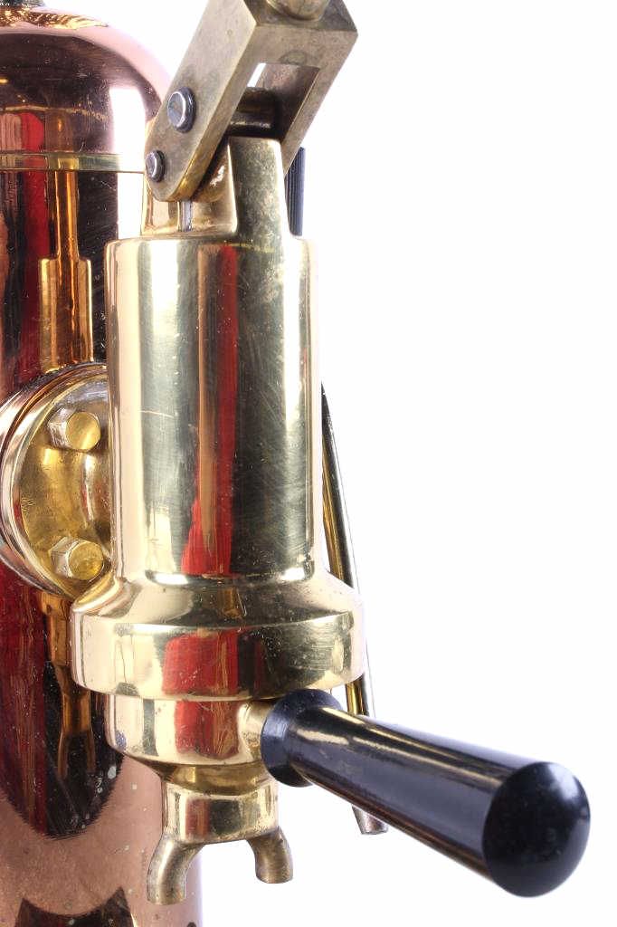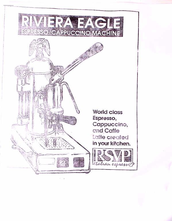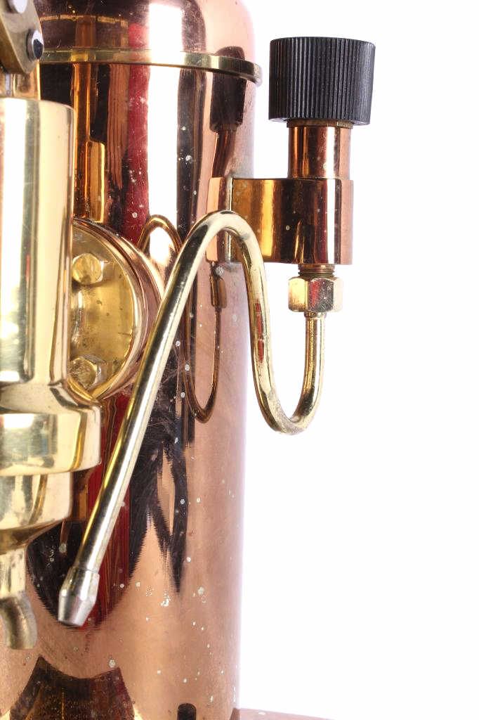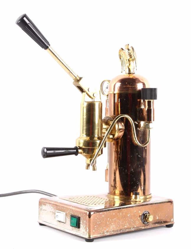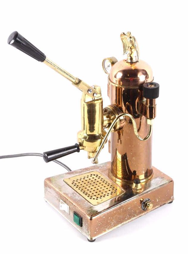 This is an original Mid Century Riviera Eagle Espresso Cappuccino Machine. This machine shows a solid copper, washed copper, and brass construction in overall good condition. The piece does work and is believed to have all the necessary parts. The bottom area has lost some of the copper wash. Elektra SRL RSVP. One of the best Espresso Machines of its time. Measures 8.5"x10.5"x18.75"