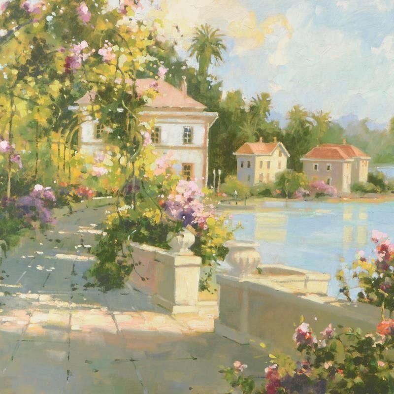 "Riviera Walk" is a hand embellished limited edition giclee on stretched canvas by Marilyn Simandle, numbered and hand signed by the artist. Includes Letter of Authenticity. Measures approx. 40" x 30" (image).