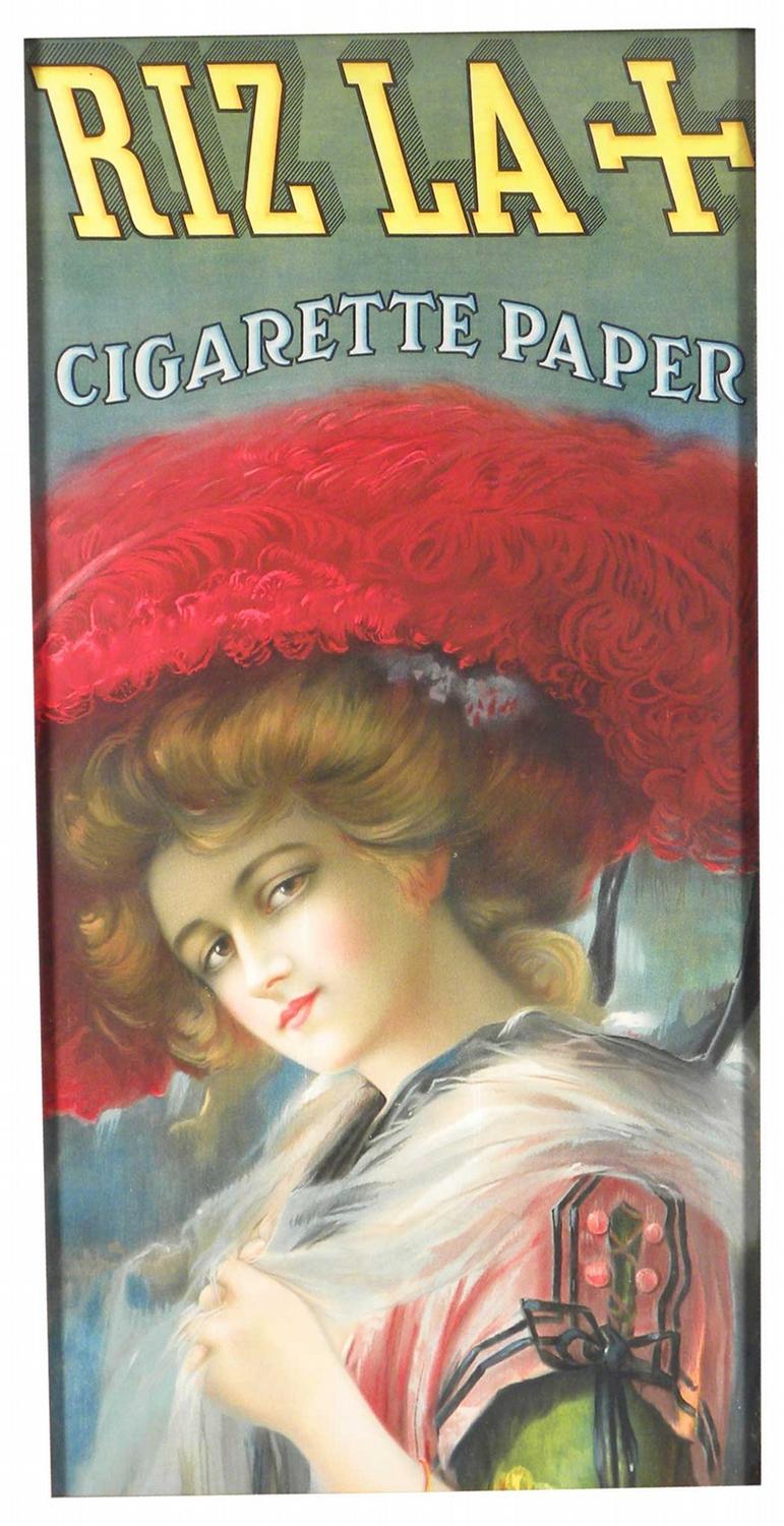 Riz La Cigarette Paper Paper Sign. Framed under glass in period oak frame. Excellent condition. 16 3/4 X 34 inches image only.