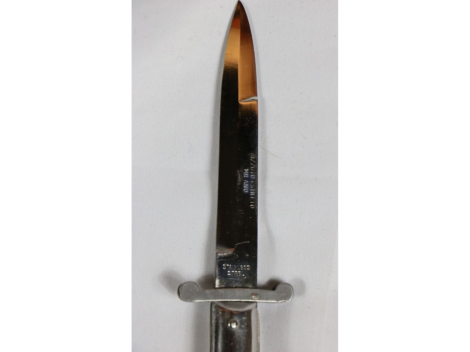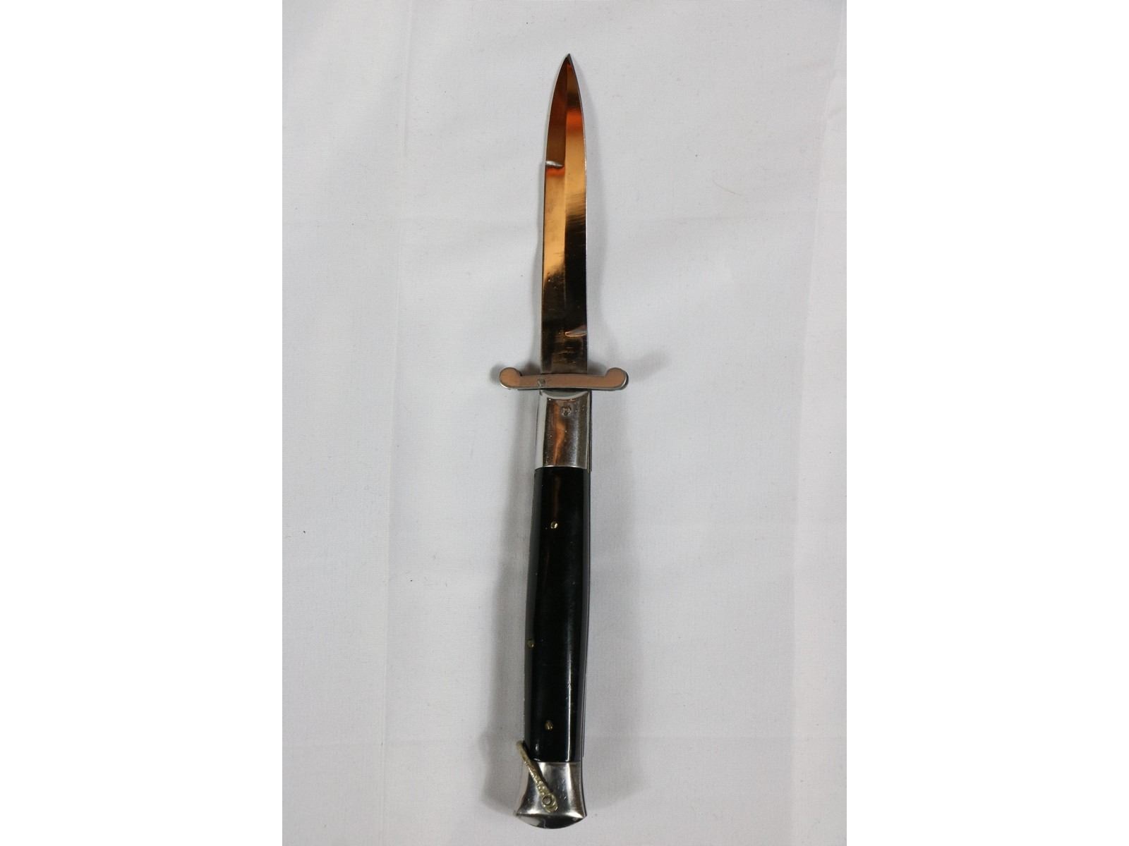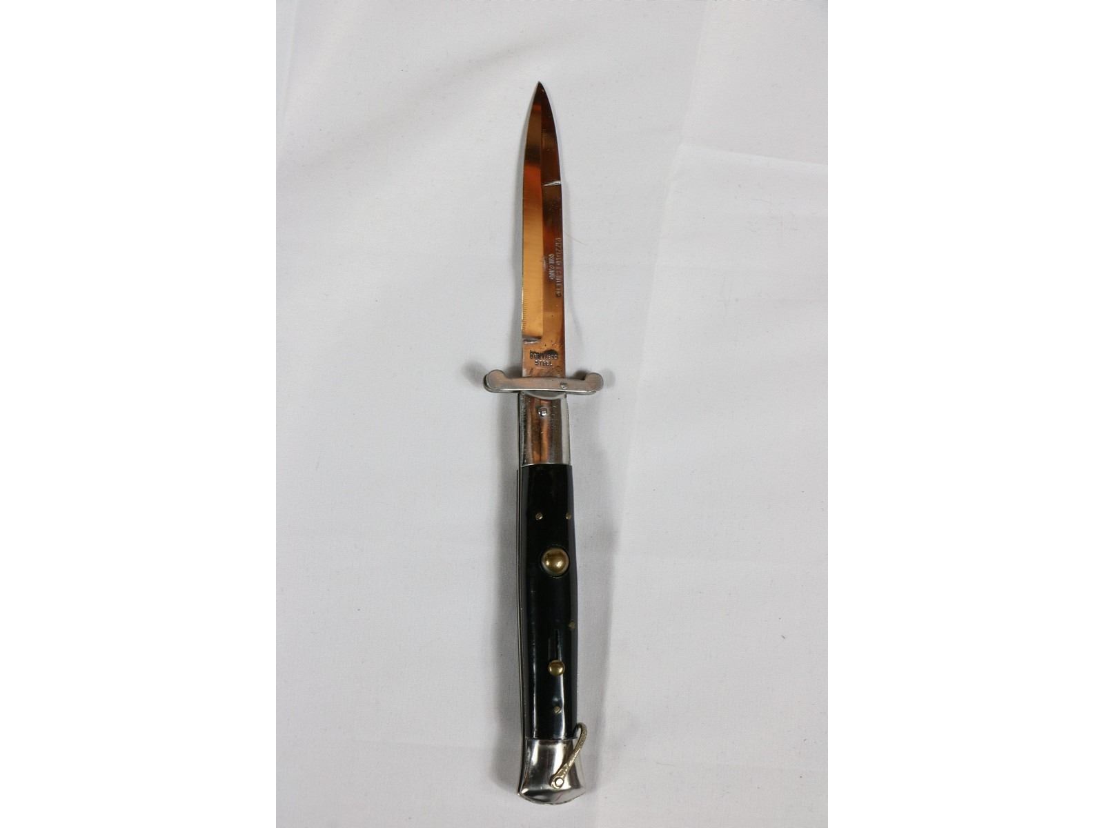 Type: side opening. Country: Italy. Manufacturer: Rizzuto Estileto. Release: push button. Length: 8 5/8". Scales: black plastic. Bolsters: nickel. Liner: steel. Condition: very good. Tang markings: "Stainless steel Rizzuto Estileto". Blade markings: "Milano"