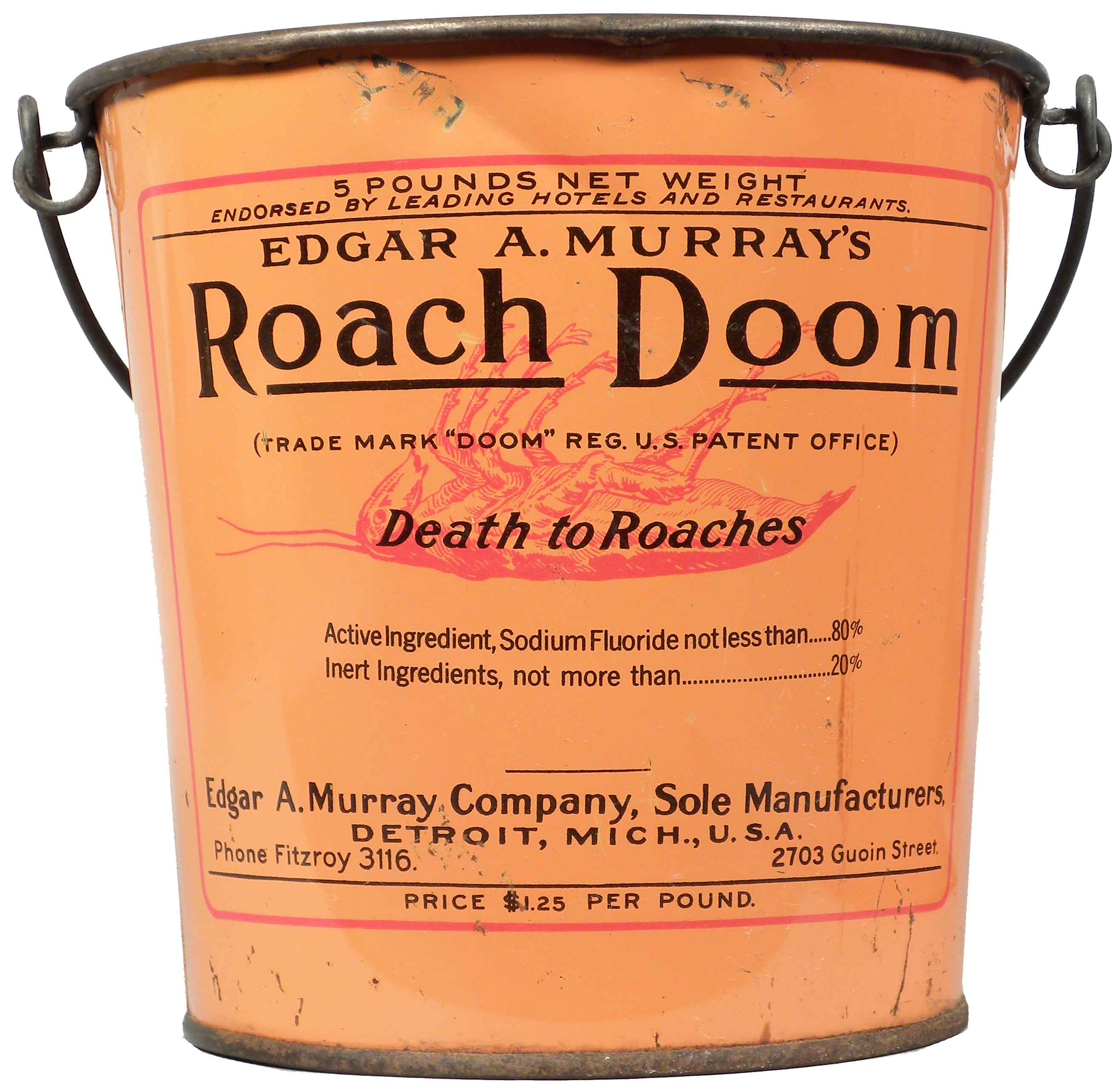 Roach Doom 5 lb Pail. "Death to Roaches", endorsed by leading hotels and restaurants. Edgar A. Murray Co. Detroit, MI