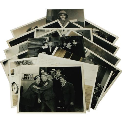 <B>Roach Studios Photos.</B></I> The starting place for the likes of Will Rogers, the Our Gang kids, Thelma Todd, Zasu Pitts, Harold Lloyd, Laurel and Hardy, and others, Hal Roach's studios helped define comedy in American cinema. This set of b&w 8" x 10" photos includes signed photos of stunt pilot Hap Hazard and child actor Peter Barton, and numerous stills from the "Taxi" series of comedy shorts, many of which feature Nelson Story (he's easy to spot, most of the photos have an arrow sketched on them pointing him out!). The photos are in overall great condition with mild tanning and the occasional crease, tear, or tack hole. A nice, rare set from a special chapter in American cinema history.