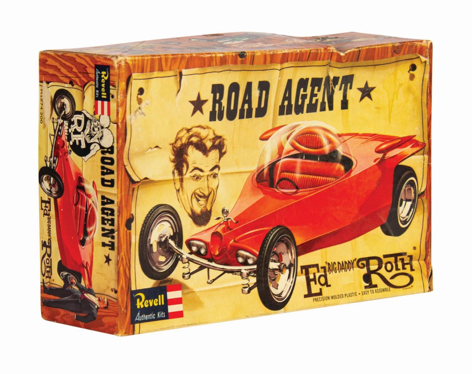 (Revell, 1964) A vintage Revell model kit of the Road Agent show car designed by legendary car customizer and visual artist, Ed "Big Daddy" Roth. This particular kit once belonged to Roth himself, and now comes from the personal collection of his son, Darryl Roth. The first of many custom rear-engine cars built by Roth, the Road Agent was comprised of a Corvair engine in a frame of chrome moly tubing on a '37 Ford suspension. This complete 1/25 scale model kit consists of white, chrome-colored, and other plastic elements, design features, and instruction manual all still sealed within the original plastic bag as issued. The original paper box measures 6.25"x9.5" and 3.25" tall and is in good condition. It exhibits some denting with attendant creases to lid, an aftermarket price label on the right side of lid, edge wear, and separation along a perforated corner. The model elements are clean and as-new.