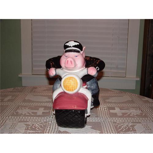 "Road Hog" Cookie Jar made by Clay Art in 1996. This would be a great collectible for pig or motorcycle enthusiasts. He is in Excellent Condition and has original box.