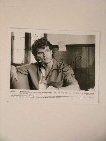 From the 80's heartthrob Patrick Swayze, a black and white studio lobby card from his hit action picture "Road House", signed by Patrick. (8x10).