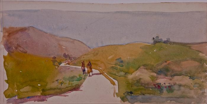 Hilda May Gordon (1874-1972). British archaeologist and painter. Studied under Frank Brangwyn and Sir Hubert von Herkomer at the Bushy School of Art and joined Brangwyn on a painting trip to Italy in 1900. A significant part of her paintings consists of tens of aquarelles painted in Palestine around the year 1900. Although inspired by the Orientalist academic trend, some individual shades can be traced in Hilda May Gordon's small paintings, in particular her tendency towards the light cloudy shade, and her remote view which is always one of a curious but cautious tourist.She set off travelling for a few months in 1922 and ended up going on a trip around the world, which lasted six years. During this time she visited India, Kashmir, Tibet, Burma, Thailand, Indonesia, China and Japan and produced a large body of watercolour paintings - the product of her keen ability to render people and the atmosphere of exotic places in colourful compositions.