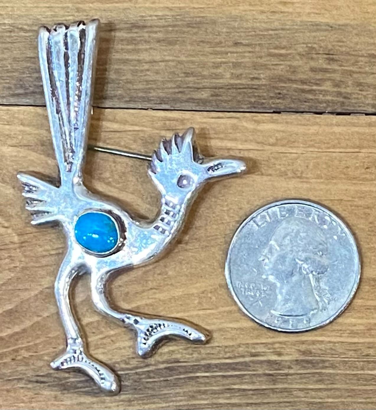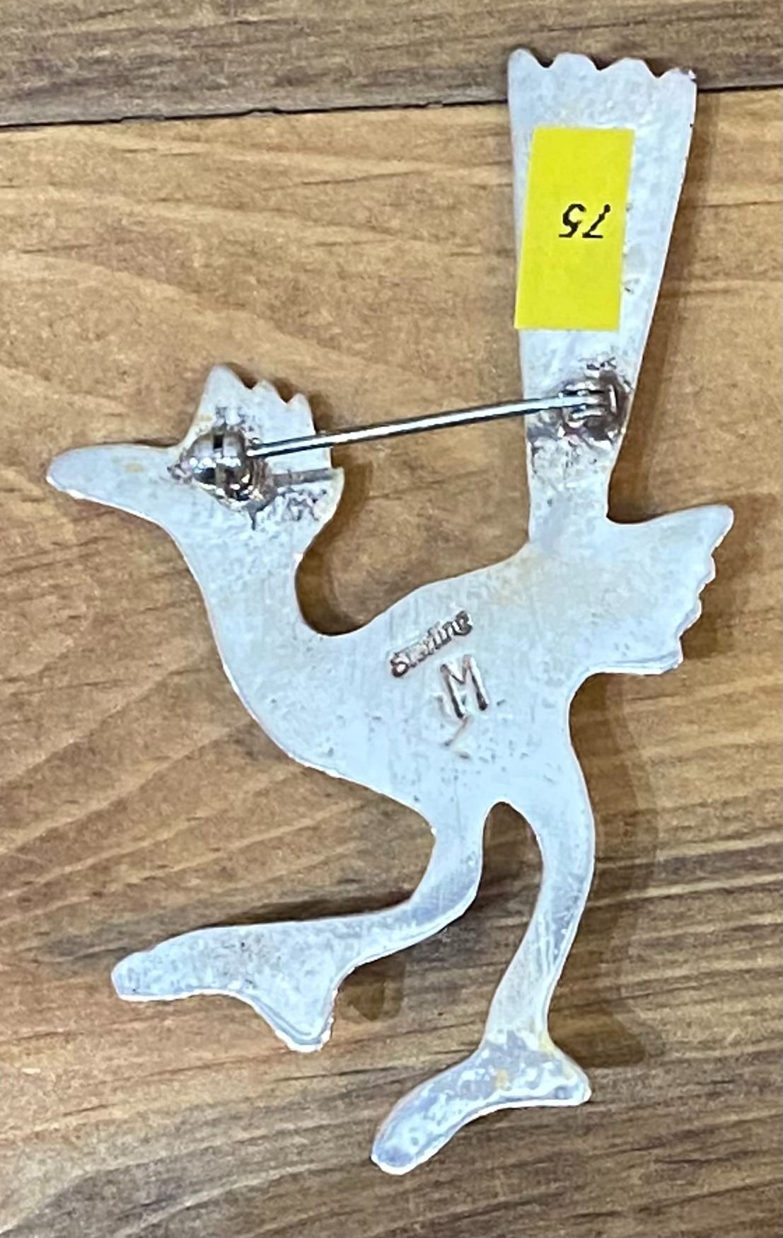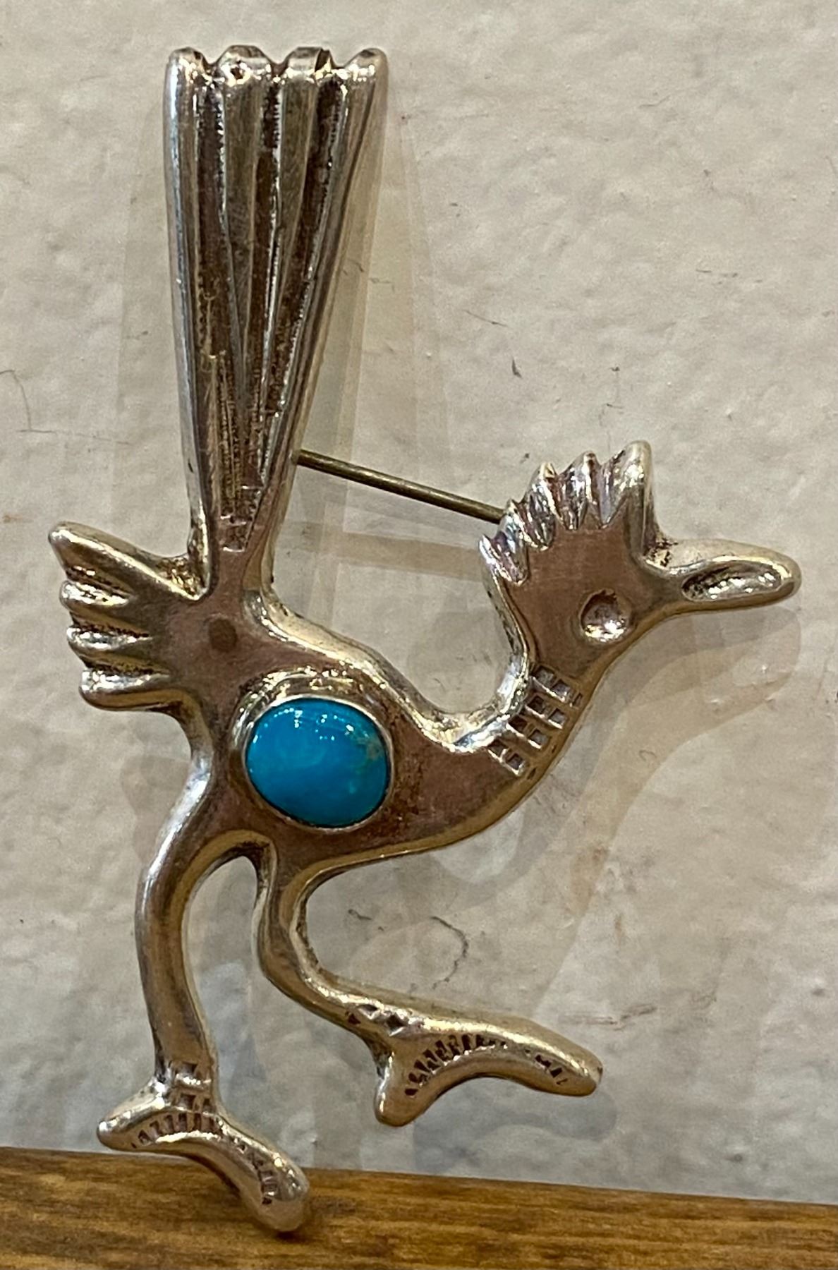 Roadrunner Pin by Mildred Parkhurst, Navajo Artist. Nice Cast Silver mold on this Whimsical Roadrunner, 16 grams