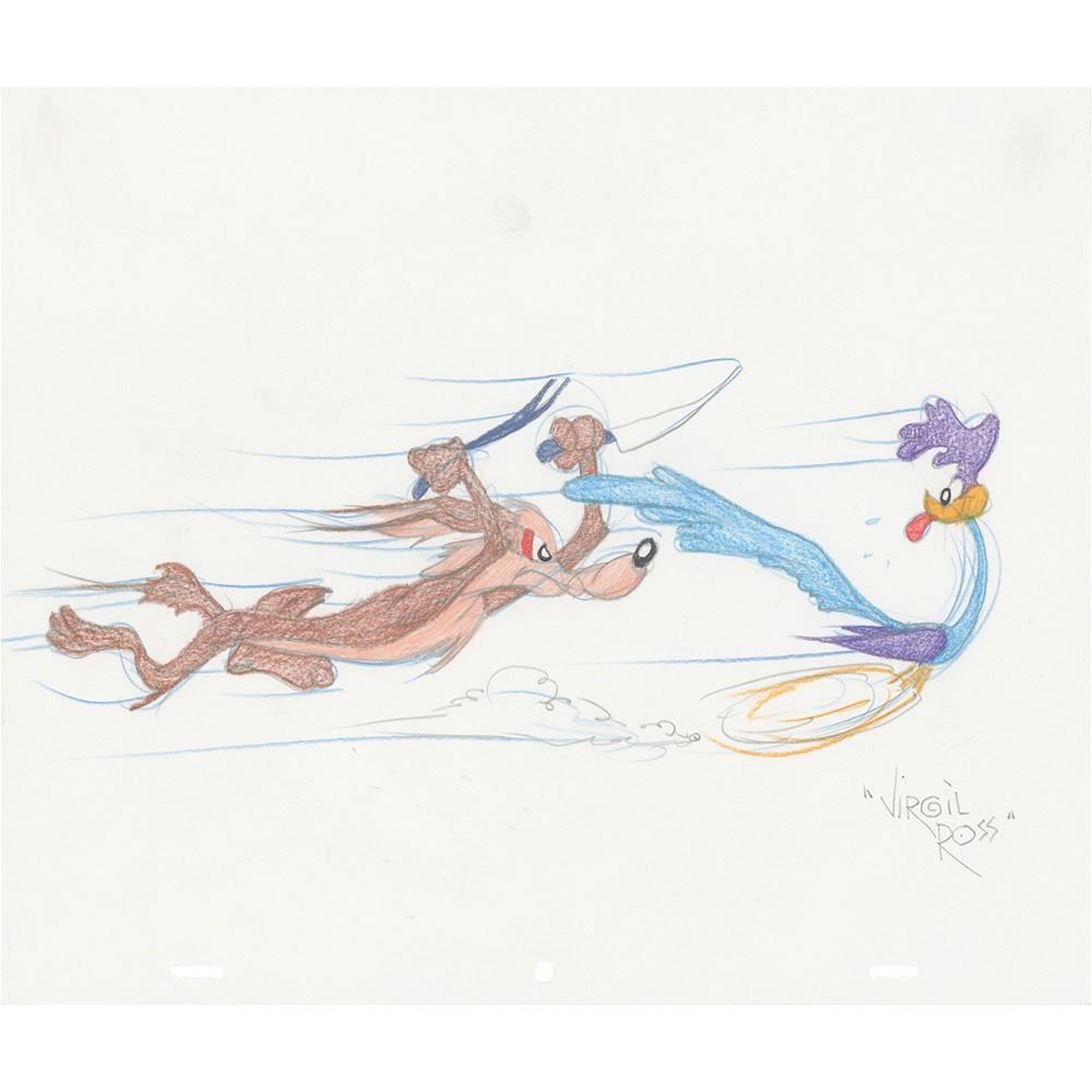 (Warner Brothers Studios, 1990s) Original drawing by Virgil Ross of Wile E. Coyote and the Roadrunner, which depicts the always hungry coyote chasing fruitlessly after his fleeing feather feathered foe with a knife and fork. Accomplished in graphite and colored pencil on untrimmed 12.5 x 10.5 animation paper, signed at the bottom in pencil, "Virgil Ross." In fine condition. This one-of-a-kind drawing was done to be sold in the Warner Brothers Studio stores in the 1990s. An action-packed drawing of these classic cartoon adversaries.
