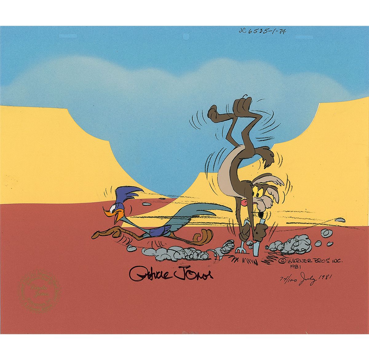 (Warner Brothers Studios, 1981) Original limited edition cel featuring Roadrunner and Wile E. Coyote entitled ‘Missed Again,’ numbered 74/100, signed at the bottom in black felt tip by Chuck Jones. The cel is placed on a color hand-cut background. Image measures 8 x 6, with overall dimensions of 12.5 x 10.5. The piece has the Linda Jones Enterprises seal on lower left. In fine condition. A wonderful early piece and the smallest edition size produced.
