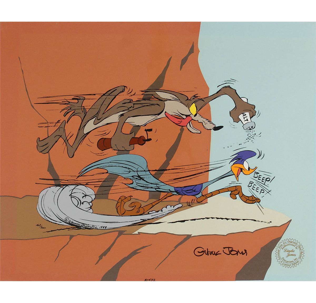 (Warner Brothers Studios, 1988) Original limited edition cel featuring Roadrunner and Wile E. Coyote entitled ‘Salt & Pepper,’ numbered 163/300, signed at the bottom in black felt tip by Chuck Jones. The cel is placed on a color copy background. Image measures 12.5 x 7, with overall dimensions of 16.5 x 13.5. The piece has the Linda Jones Enterprises seal on lower right. In fine condition.