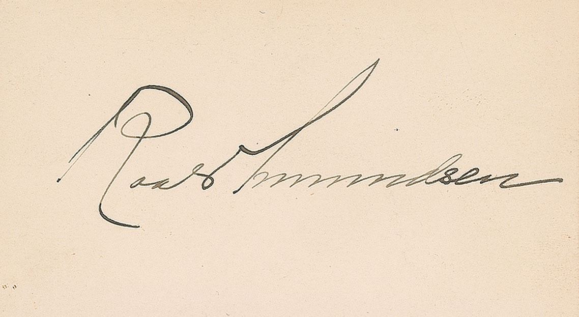 Vintage fountain pen signature, "Roald Amundsen,” on an off-white 4 x 2.25 card. In fine condition.