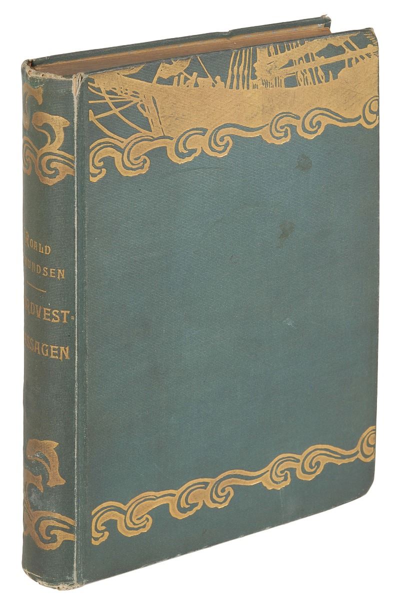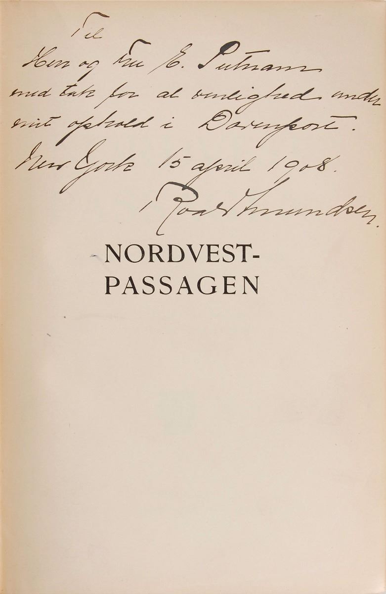 Desirable signed book in Norwegian: Nordvest–Passagen. First edition. Kristania: H. Aschenhoug & Co., 1907. Hardcover, 6.5 x 9.25, 511 pages. Signed and inscribed in Norwegian on the half-title page in black ink by Amundsen, who adds the date, “New York, 15 April 1908.” In fine condition. Inscribed just five months after publication, this incredible first edition predates Amundsen’s expeditions to the South Pole, the Northeast Passage, and the North Pole.