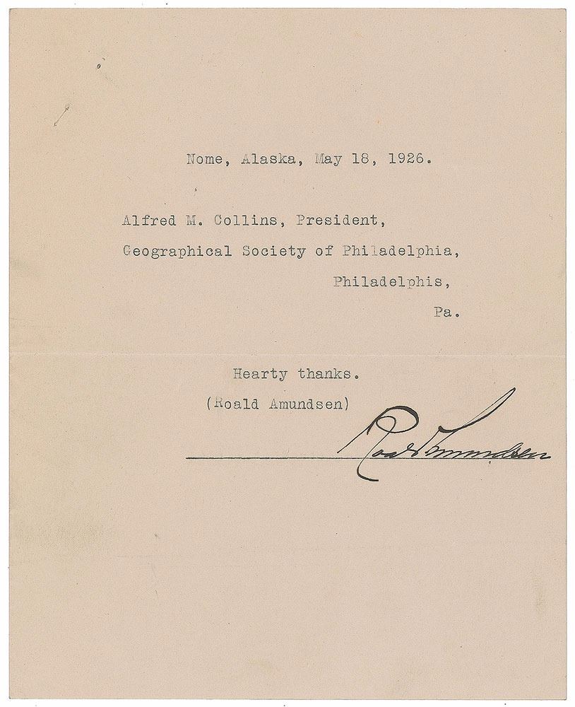 Norwegian explorer (1872–1928) who navigated the Northwest Passage, fixed the position of the North Magnetic Pole, and was the first to reach the South Pole. TNS, one page, 6 x 7.5, May 18, 1926. Written from Nome, Alaska, Amundsen extends a two-word note of appreciation to Alfred M. Collins, the president of the Geographical Society of Philadelphia: "Hearty thanks." In fine condition, with pin holes to the upper left corner area. Collins was a well-known explorer and sportsman who made several trips to Africa and other regions in search of big game.