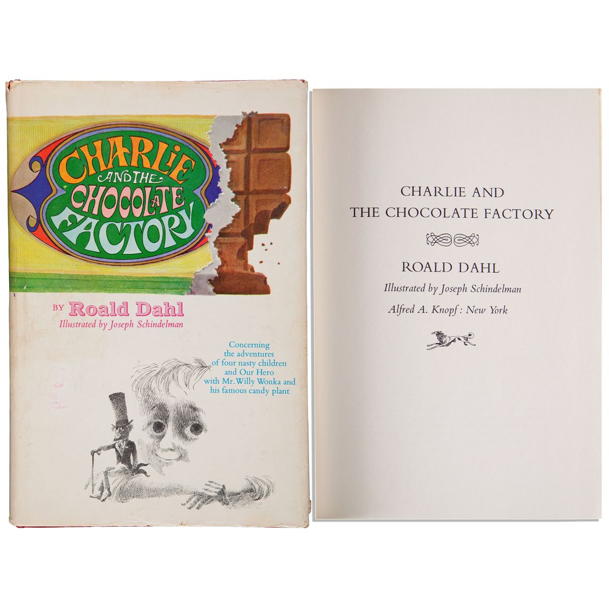 First edition, first printing of ''Charlie and the Chocolate Factory'' by Roald Dahl. Alfred A. Knopf: New York: 1964. Illustrated by Joseph Schindelman. With all first edition, first printing points present, including a six-line colophon on last page. With the original first issue color pictorial price-clipped dustjacket displaying no ISBN number on the rear panel. In original red cloth boards with title blindstamped on cover. Previous owner's name on front free endpaper. Dustjacket and book have minor wear, else very good condition.