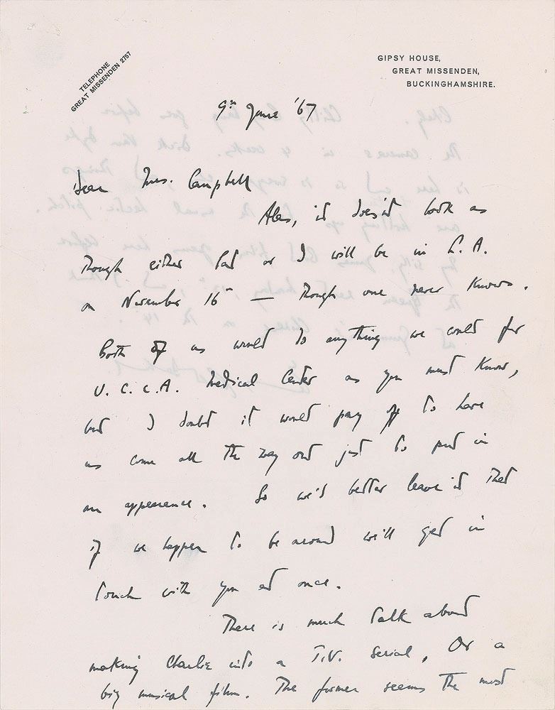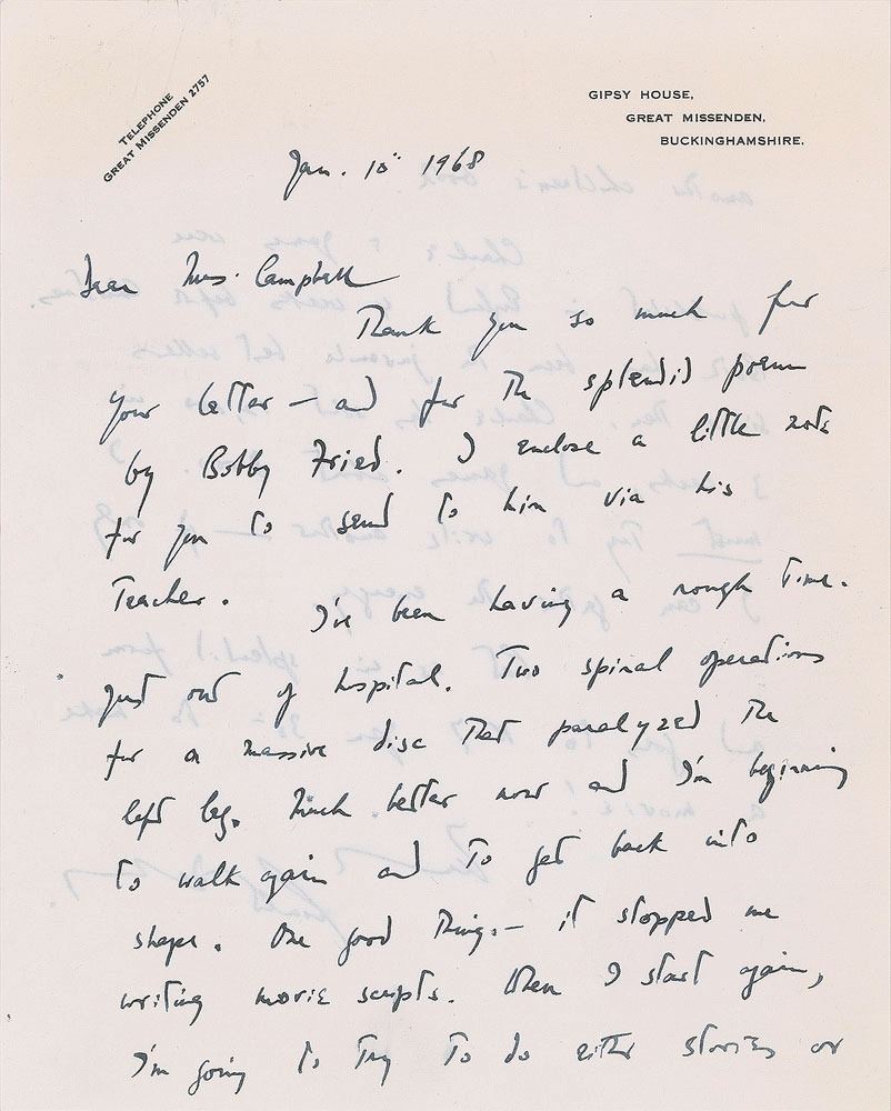 The second letter, January 10, 1968, in part: “I’ve been having a rough time. Just got out of hospital. Two spinal operations for a massive disc that paralyzed the left leg. Much better now and I’m beginning to walk again and to get back into shape. One good thing—it stopped me writing movie scripts. When I start again, I’m going to try to do either stories or another children’s book. Charlie & James were published in England 4 weeks before Christmas. Both have been the juvenile best sellers since then. Charlie has sold 12,000 in 3 weeks, and James about 8000. I must try to write another—if only I can gather the energy.”