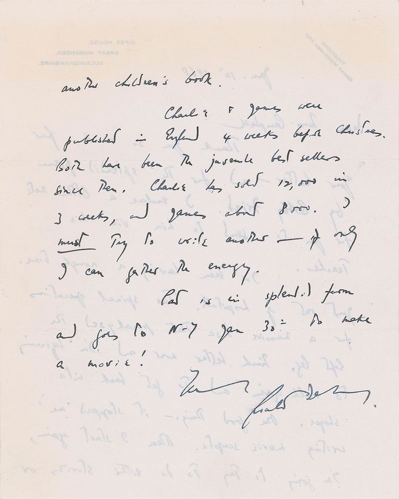 Phenomenal grouping of three ALSs signed “Roald” or “Roald Dahl,” six total pages, ranging in size from 8 x 10 to 8.25 x 10.5, dated between 1967 and 1971. Each addressed to Blanche Campbell, the owner of Campbell’s Bookstore in Los Angeles. The earliest letter, June 9, 1967, in part: “It doesn't look as though either Pat or I will be in L.A. on November 16—though one never knows. Both of us would do anything we could for U.C.L.A. Medical Center, as you must know...There is much talk about making Charlie into a T.V. Serial. Or a big musical film. The former seems the most likely. Chitty Bang Bang goes before the cameras in 4 weeks. Dick van Dyke is here and so is everyone else, and things are hotting up for the usual hectic pitch. My silly James Bond film opens here before the Queen next Monday, 12th, and I think at Grauman’s Chinese on the 14th.”