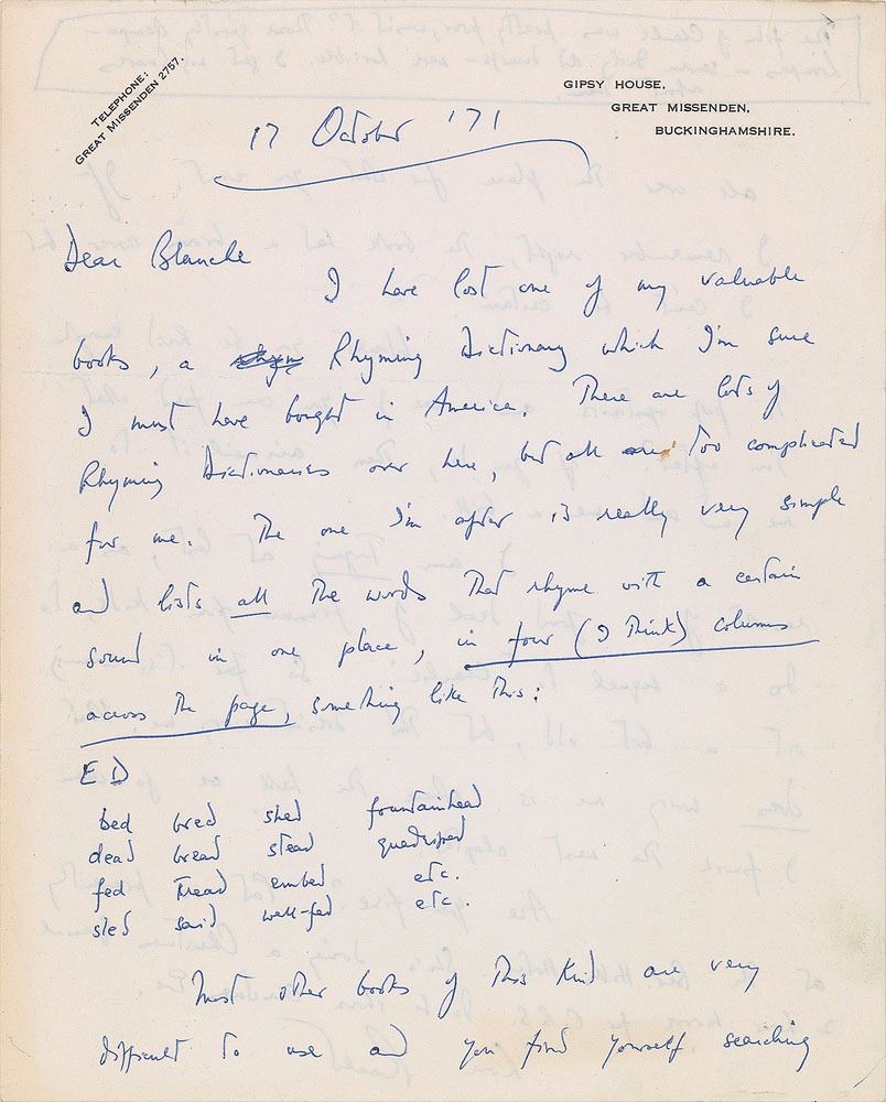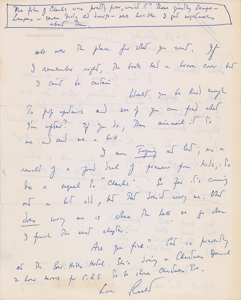 The last letter, October 17, 1971, in part: "I have lost one of my valuable books, a Rhyming Dictionary which I’m sure I must have bought in America. There are lots of Rhyming Dictionaries over here, but all are too complicated for me. The one I’m after is really very simple and lists all the words that rhyme with a certain sound in one place, in four (I think) columns across the page, something like this: ED / bed bred shed fountainhead / dead bread stead quadruped / fed tread embed etc. / sled said well-fed etc…The film of Charlie was pretty poor, wasn’t it? Those ghastly Oompa-Loompas—seven dirty old dwarfs—were horrible. I get nightmares about them…I am trying at last, as a result of a good deal of pressure from kids, to do a sequel to ‘Charlie.’ So far it’s coming out a bit odd, but that doesn’t worry me. What does worry me is where the hell we go when I finish the next chapter.” In overall fine condition, with staple holes to the upper left corner of each letter. Accompanied by a copy of a letter from Campbell to Mary Poppins author P. L. Travers, in which she explains that Dahl “was a frequent visitor to our Children’s Dept. when his wife was recuperating at the UCLA Medical Center which is right across the street from our store. He kept us supplied with autographed copies of ‘Charlie and the Chocolate Factory.”