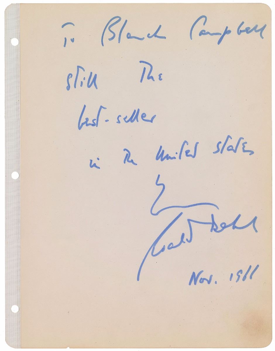 ANS, one page, 8.5 x 11, circa 1961. Brief note to Blanche Campbell, in full: "Still the best-seller in the United States. Roald Dahl, Nov. 1961." In fine condition, with light soiling to the lower right corner. Dahl is likely referring to his popular children's novel James and the Giant Peach, which was published the very year this note was penned.