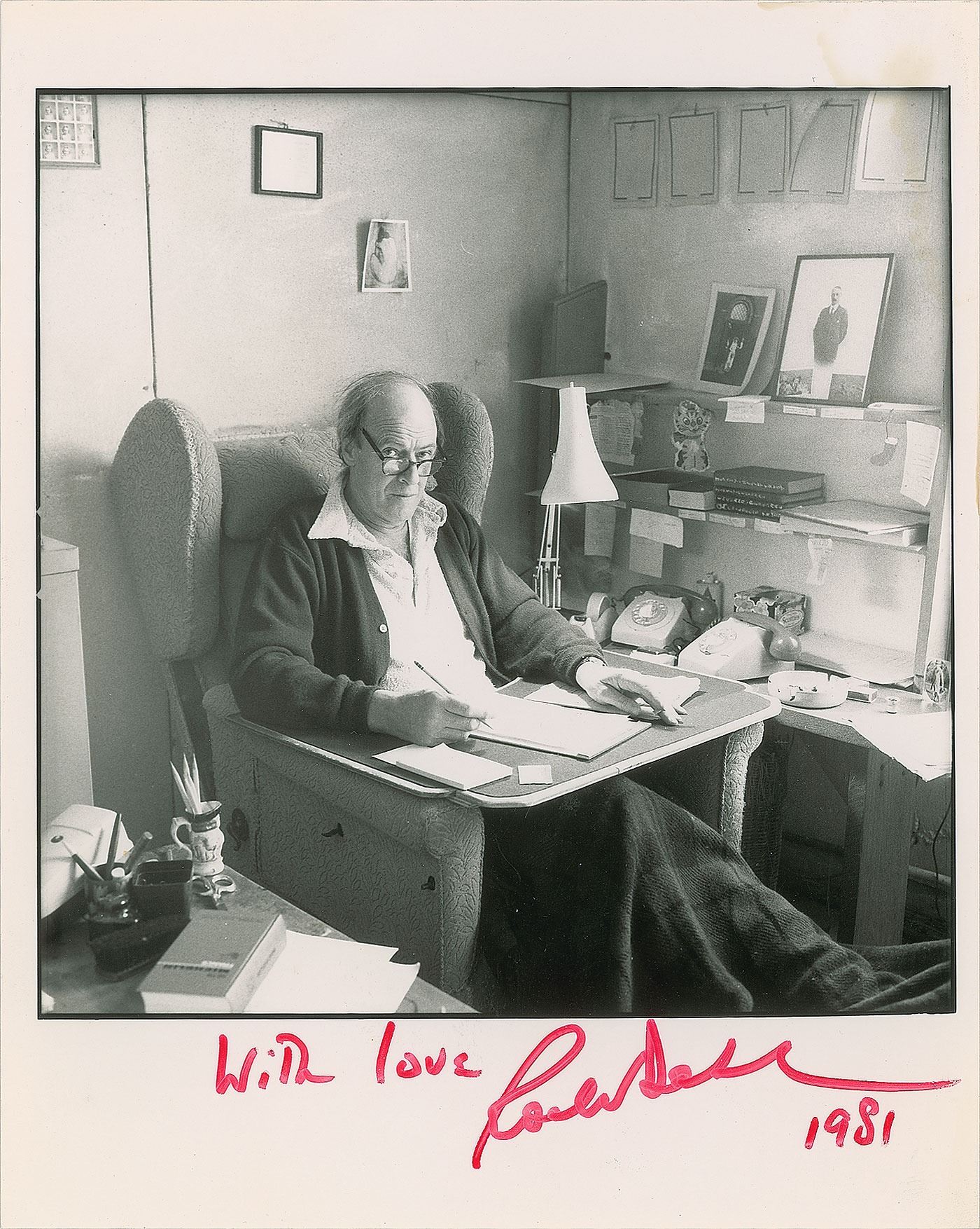 Glossy 8 x 10 photo of Dahl working in his office, seated in a large armchair with a custom desktop, signed in the lower border in red felt tip, "With love, Roald Dahl, 1981." In fine condition, with scattered light surface creasing.