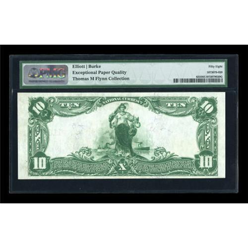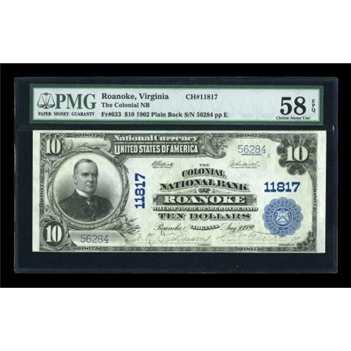 <B>Roanoke, VA</B></I> - $10 1902 Plain Back Fr. 633 <B>The Colonial NB</B></I> Ch. # 11817<BR> While quite easily available in small size,large notes from this institution are quite scarce, with the census showing only about a dozen examples in all grades combined. This newly discovered specimen from the Flynn collection is far superior to any previously reported specimen, as the highest grade large note listed from here graded only Very Fine. Bright PMG <B>Choice About Uncirculated 58 EPQ.</B></I><BR><I>From The Thomas M. Flynn Collection</B></I><BR><BR><b>Shipping:</b> Coins & Currency (<a target="_blank" href="http://www.heritageauctions.com/common/shipping.php">view shipping information</a>)