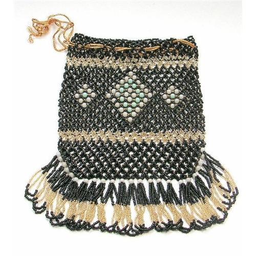 </font></strong>This Art Deco bead work meshed purse, produced from black beads, with gold, blue and lavender beaded pattern, golden drawstring and a looped beaded tassel fringe. Featuring high quality diamond shape meshed beads in a fishnet pattern. This antique drawstring purse is undamaged and in excellent condition.</font>