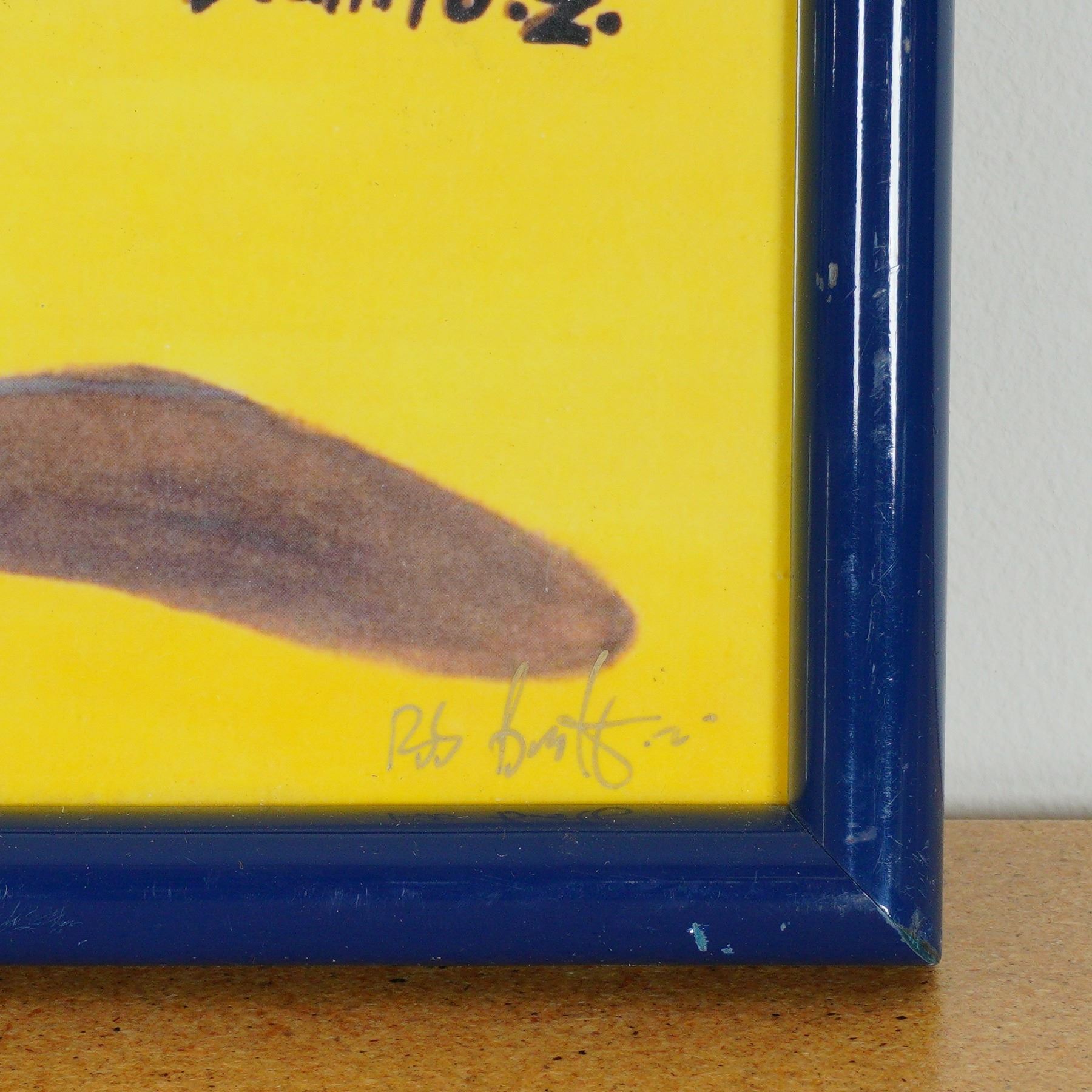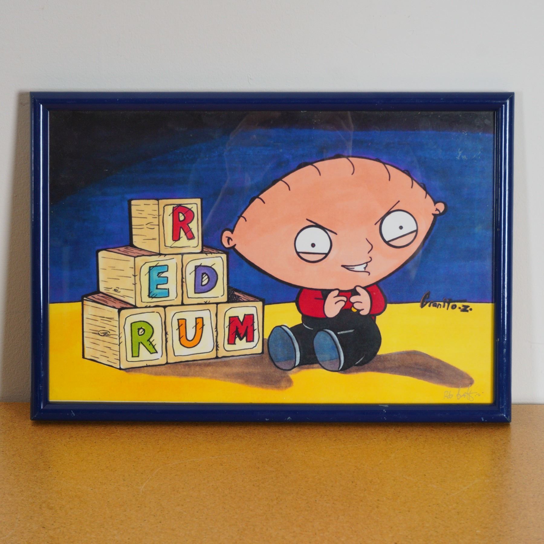 Color print featuring Stewie Griffin from Family Guy seated beside wooden toy blocks spelling REDRUM, a playful nod to The Shining. The artwork captures Stewie's mischievous expression against a bold blue and yellow background. Presented in a blue wood frame under glass with its original paper backing and hanging wire. A striking pop culture parody that blends animation humor with a dark cinematic reference. Signed in the plate by Granito Z. and also bearing his signature in pencil on lower right.
