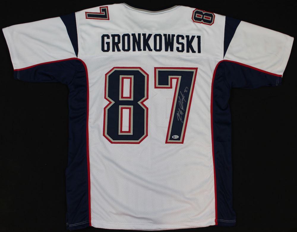 Custom on-field style jersey with everything sewn on. Jersey has been hand-signed in silver paint pen by Rob Gronkowski.