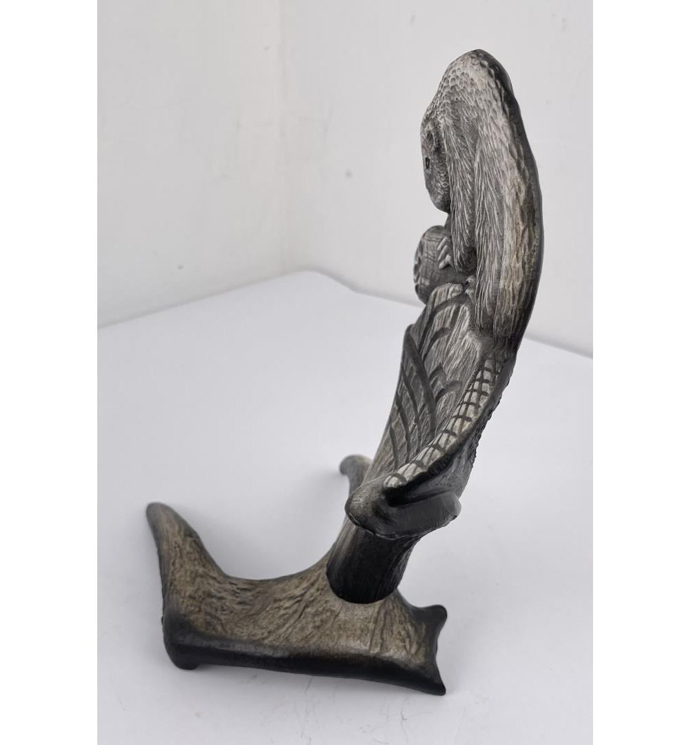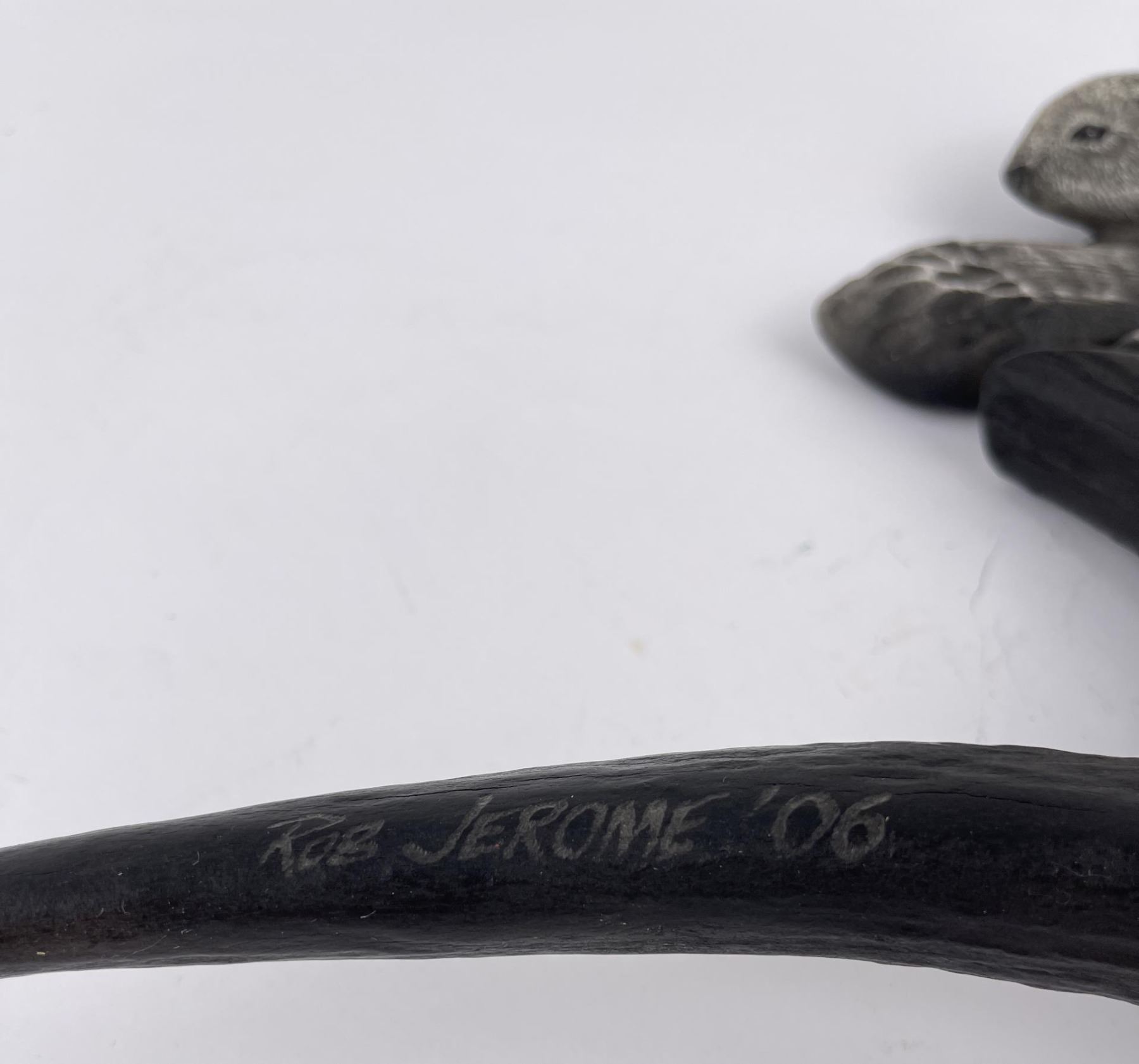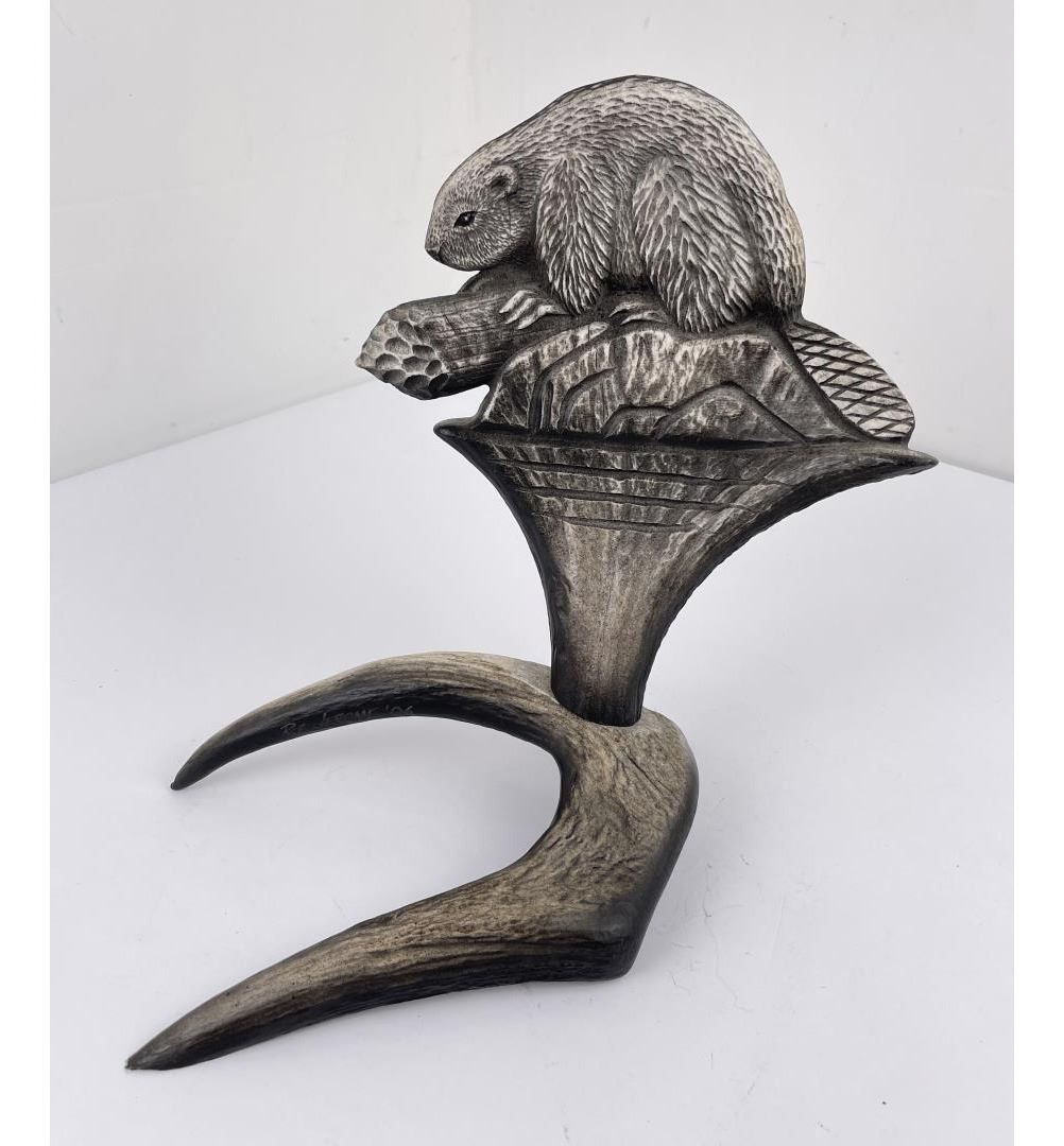Beaver carved and signed by Rob Jerome. Measures just over 12" tall Robert Jerome is a Metis artist from northern Saskatchewan who carves in both antler and stone. He enjoys fishing and other outdoor activities and says, "The land, the animals and the people that live here are my inspiration". Robert's father, Roger Jerome, is also an artist and encouraged his son to experiment in expressing himself with the tools at hand.