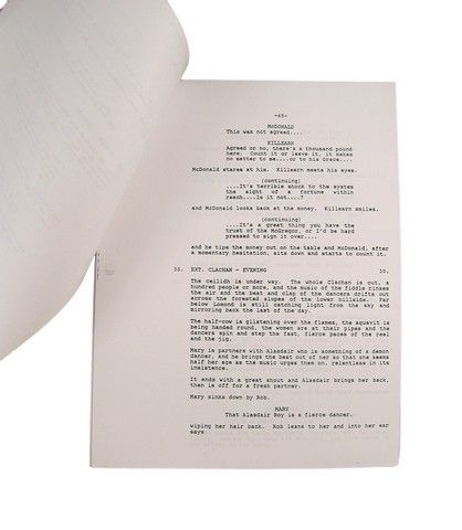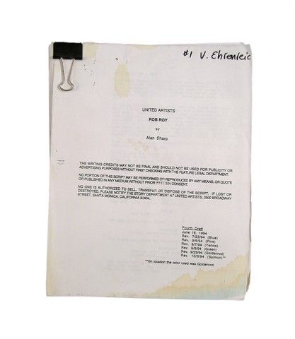 Rob Roy Screenplay - A production copy of the screenplay to the acclaimed 1995 feature "Rob Roy" chronicling the life of the hero of Scotland in the 1700's. It starred Liam Neeson, Jessica Lange, John Hurt, Tim Roth and Eric Stoltz. This was a "clipped" production copy, and shows signs of age with some staining on the cover and several pages. Script comes from the collection of makeup artists Tom and Bari Burman.