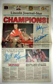 Nebraska Cornhuskers commemorative Lincoln Journal Star Newspaper hand autographed by, Cory Schlesinger, Ed Stewart, Rob Zatechka, and Zach Wiegert. A great item to recognize the NCAA National Champions of 1995. Certificate of Authenticity from Scoreboard.