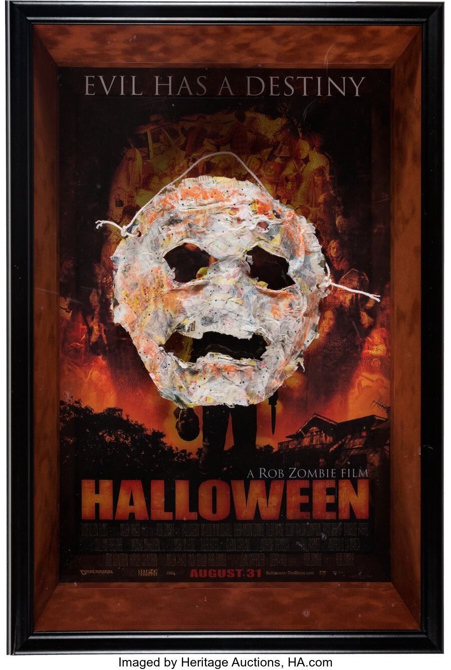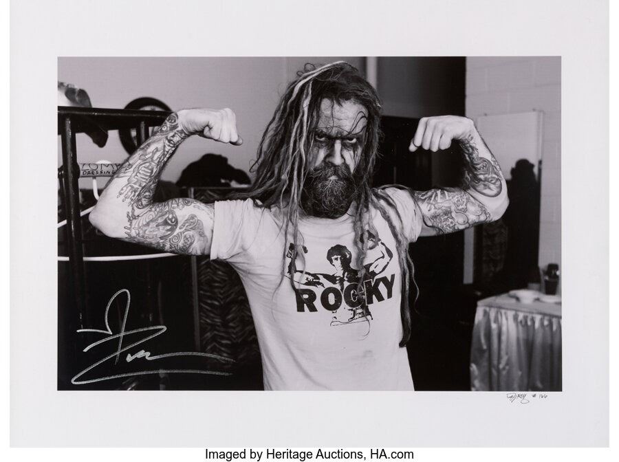 Includes: 1)A rolled, mixed media print of Zombie, signed with a silver felt tip (as well as the photographer and numbered 166). When flattened, measures 17 ¾" x 23 ¾". In Very Good Plus condition with creasing due to rolling; 2)A 7" x 8" paper mâché mask used in Rob Zombie's first Halloweenfilm in the franchise, a reboot of the storyline, released in 2007. While not worn on actor Daeg Faerch's face, it is one the many masks a young Michael Myers created (and hung in his cell) while held in an asylum for murdering his mother's boyfriend, his older sister, and her boyfriend.
