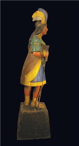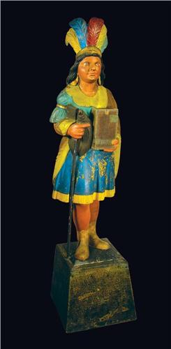 1800s Samual Robb Wood Cigar Store Indian Maiden holding a Tobacco leaf and a cigar box. This figure is not signed but is unmistakably attributed to Robb. All of the paint appears to be original. Shows some ages cracks but nothing major. Most significant one is down the back. She stands a total of 59 inches including the base. The base which is original to the Indian shows some of the original lettering, however, it is very faint. A classic figure that would enhance even the most advanced collection.