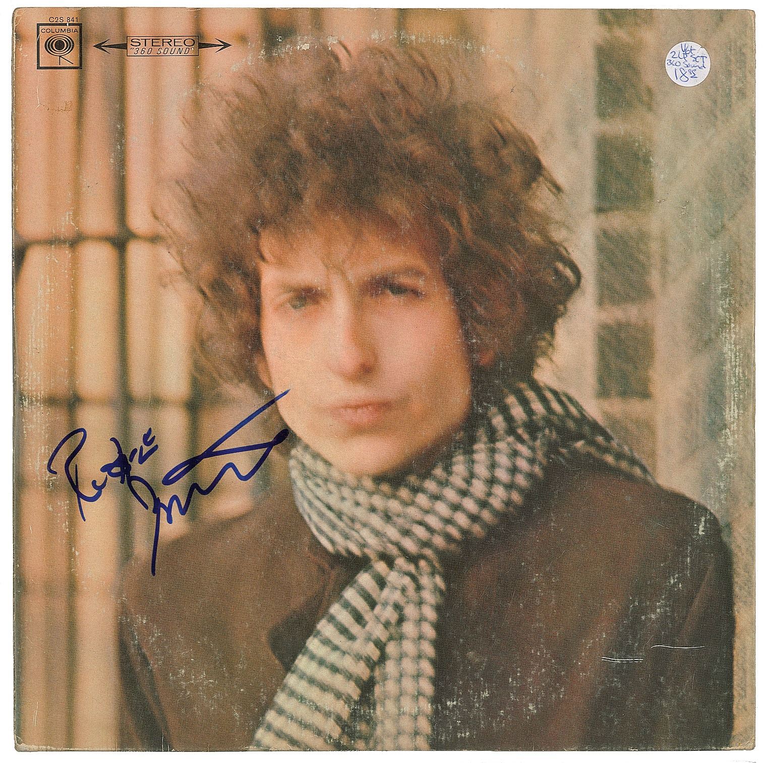 Blonde on Blonde album signed on the front cover in blue felt tip by Robbie Robertson. In very good to fine condition, with light scuffing, and an affixed price sticker. The record is included.