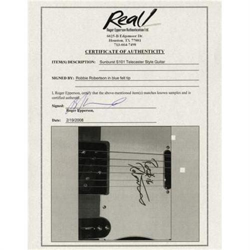 <B>Robbie Robertson Signed Guitar.</B></I> A sunburst finish S101 electric guitar with a The Band logo on the body, signed on the pick guard by Robbie Robertson in blue felt tip. In Excellent condition. <I> Accompanied by a COA from Roger Epperson Authentication LTD.</B></I><BR><BR><b>Shipping:</b> Musical Instruments, Large (<a target="_blank" href="http://www.heritageauctions.com/common/shipping.php">view shipping information</a>)