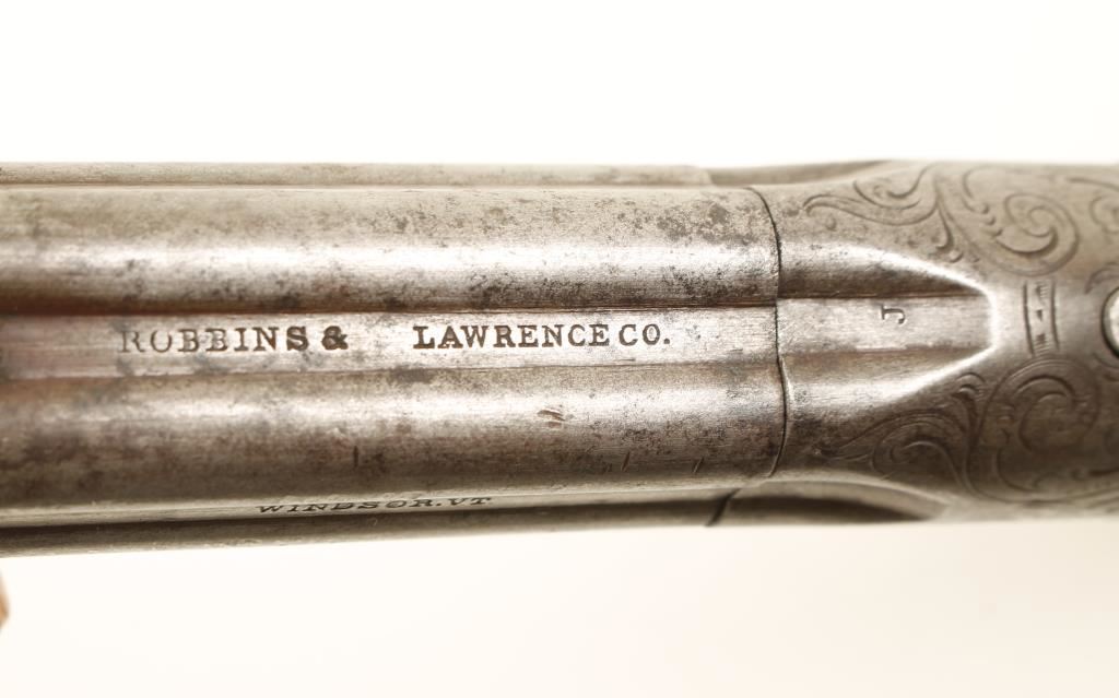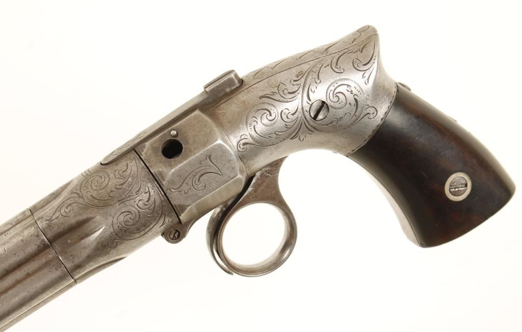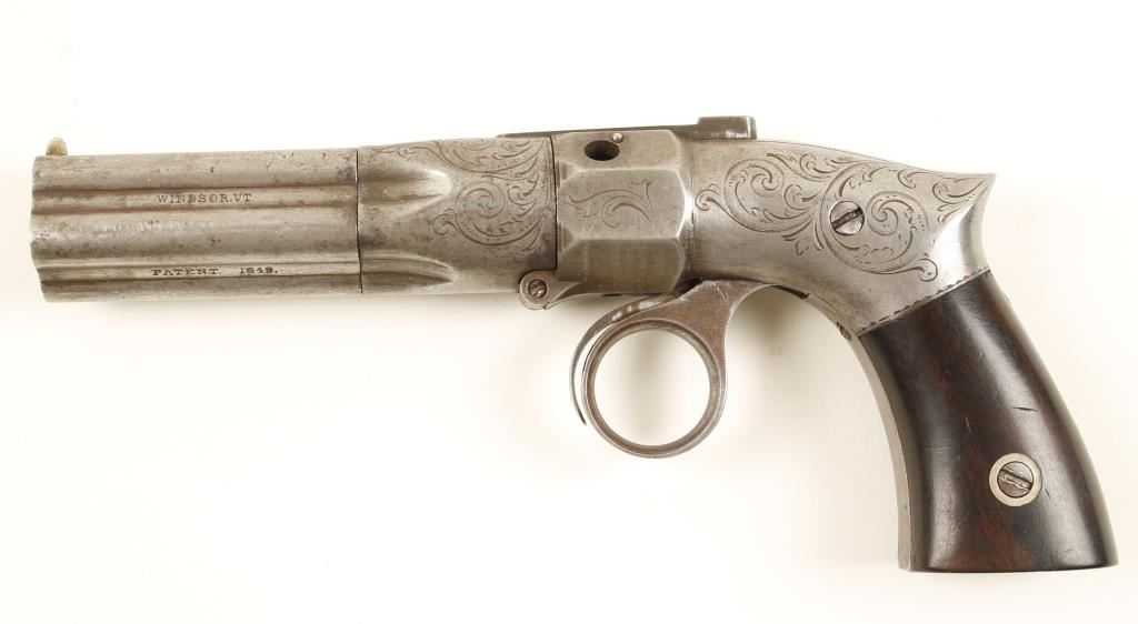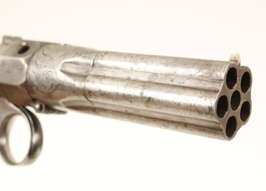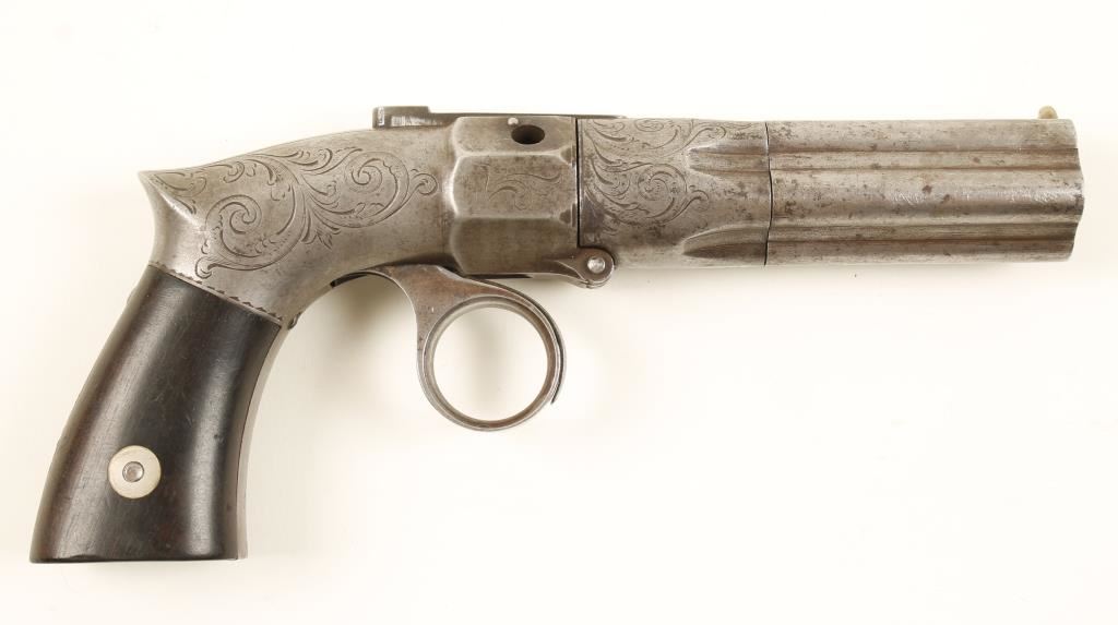 Blued with scrollwork engraved 5-barreled percussion pistol with 3.5" barrels. Finish has worn back to bare metal with rust stains and some small dings. Bores are dark and rough with pitting and strong rifling. Action doesn't work reliably. Wood grips are a wonderful fit with little damage. Condition is good to very good. *Antique Firearm*