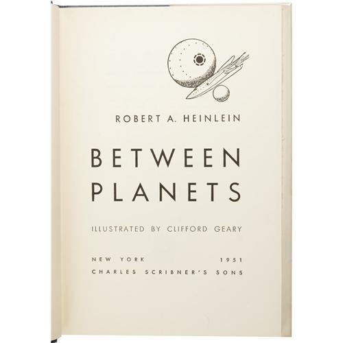 <B>Robert A. Heinlein: <I>Between Planets</B></I>.</B></I> (New York: Scribner's Sons, 1951), first edition, first printing (the letter "A" and the Scribner's seal appear on the copyright page), 222 pages, dark blue cloth with baby blue lettering on the spine and decorative stamping on the front cover, 8vo (5.5" x 8"), first issue $2.50 dust jacket (in protective Mylar). Illustrated by Clifford Geary. The fifth installment in Heinlein's juvenile series published at Scribner's between 1947 and 1958. This copy is fine, with very minimal wear to the edges of the dust jacket. "Mary Kathryn Keating" bookplate affixed to the front pastedown. <I>From the Ventura Collection.</B></I><BR><BR><b>Shipping:</b> Books & Catalogs (<a target="_blank" href="http://www.heritageauctions.com/common/shipping.php">view shipping information</a>)