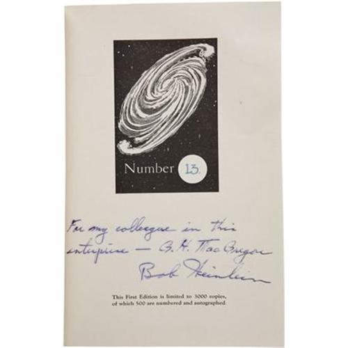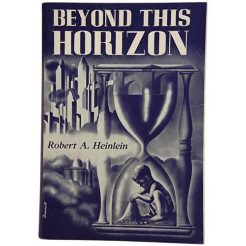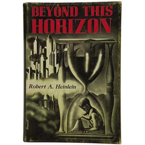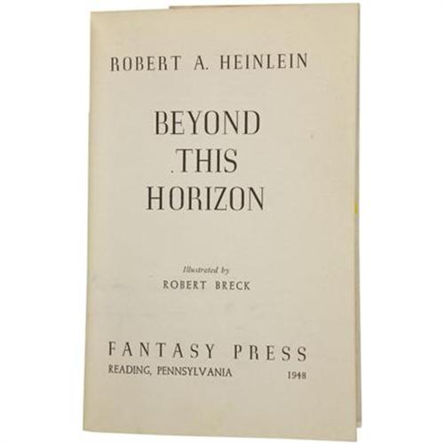 <B>Robert A. Heinlein. </B></I><B><I>Beyond This Horizon</B></I></B></I><B>.</B></I> Reading, Pennsylvania: Fantasy Press, 1948.<BR><BR>First edition. One of 3,000 limited edition copies (Currey issue A). Inscribed by the author on a special limitation page inserted in front. Twelvemo. 242 pages. Illustrations by Robert Breck. Jacket design by A. J. Donnell. <BR><BR>Publisher's original brick red cloth with gilt titles and rules on the spine. Moderate spotting to the front board, less so on the back board. Internal contents tight and with minimal toning to pages. Copy comes with both dust jacket states, in priority: A. J. Donnell design with red titles, Fantasy Press titles listed on back panel and author biography on rear flap, light shelf wear with light rubbing at head and foot of the spine and extremities; and Donnell illustration in blue and white, titles in white, back panel and flap blank, in pristine condition. This copy in overall very good condition.<BR><BR>The variant dust jacket printed in blue was a later state, not a proof as some have postulated. According to the publisher Lloyd Eshbach, the "variant jacket [was] printed when, at the end of the edition we ran out of dust wrappers. Perhaps 100 produced." <I>From the Robert and Diane Yaspan Collection.</B></I><BR><BR><b>Shipping:</b> Books & Catalogs (<a target="_blank" href="http://www.heritageauctions.com/common/shipping.php">view shipping information</a>)