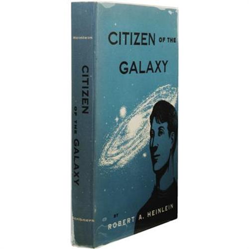 <B>Robert A. Heinlein:<I> Citizen of the Galaxy.</B></I></B></I> (New York: Charles Scribner's Sons, 1957), first edition, with "A" and "7.57v" code on copyright page, 302 pages, jacket design by Leonard Everett Fisher, tan cloth with red titles, 8vo (5.75" x 8,.25"). The eleventh installment in Heinlein's juvenile series published at Scribner's between 1947 and 1958. Fine in a fine unclipped jacket. A beautiful copy. <I>From the Ventura Collection.</B></I><BR><BR><b>Shipping:</b> Books & Catalogs (<a target="_blank" href="http://www.heritageauctions.com/common/shipping.php">view shipping information</a>)