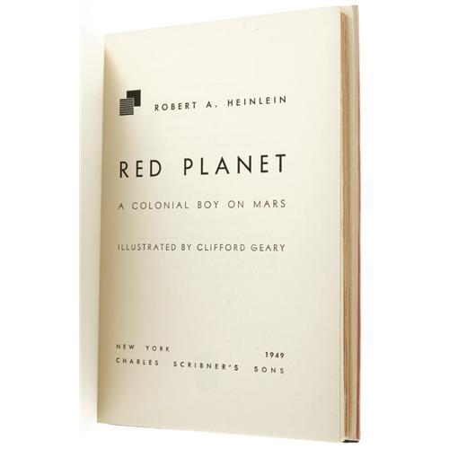 <B>Robert A. Heinlein:<I> Red Planet,</B></I> A Colonial Boy on Mars.</B></I> (New York: Charles Scribner's Sons, 1949), first edition ("A" and Scribner seal on the copyright page), 211 pages, illustrated by Clifford Geary, black cloth with red titles, 8vo (5.75" x 8.25"). The third installment in Heinlein's juvenile series published at Scribner's between 1947 and 1958. Light rubbing to front board, former owner's name in ink on the verso of the ffep, previous owner's stamp on the second ffep, else fine in a fine unclipped ($2.50) jacket. <I>From the Ventura Collection.</B></I><BR><BR><b>Shipping:</b> Books & Catalogs (<a target="_blank" href="http://www.heritageauctions.com/common/shipping.php">view shipping information</a>) <BR><BR><B>Important notice:</