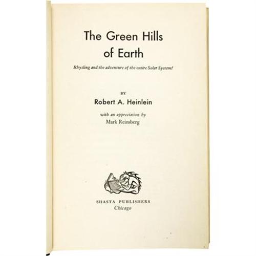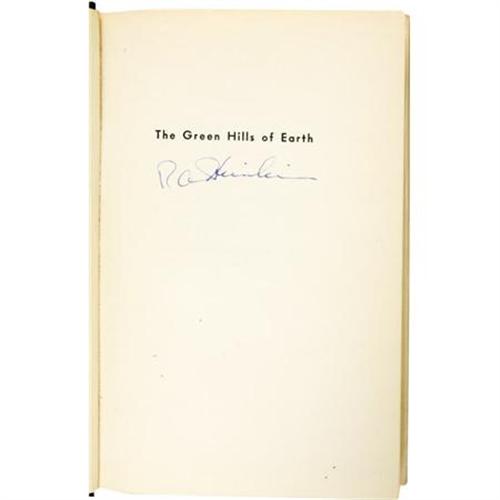 <B>Robert A. Heinlein: Signed Subscriber's Copy of <I>The Green Hills of Earth</B></I></B></I> (Chicago: Shasta Publishers, 1951), 288 pages, subscriber's copy, signed "<I>R A Heinlein</B></I>" on the half title page, jacket design by Hubert Rogers, light green boards with black cloth shelf back and gilt titles, 8vo (5.5" x 8.25"), corners bumped, else fine in a very good unclipped dust jacket with minor chipping at the spine head and tail.<BR><BR><b>Shipping:</b> Books & Catalogs (<a target="_blank" href="http://www.heritageauctions.com/common/shipping.php">view shipping information</a>)