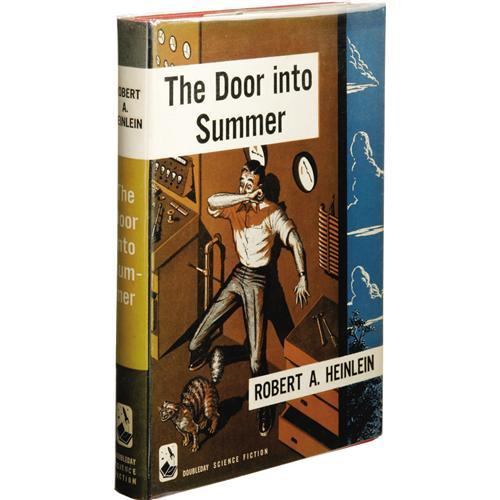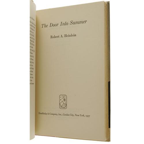 <B>Robert A. Heinlein:<I> The Door Into Summer.</B></I></B></I> (New York: Doubleday & Company, Inc., 1957), first edition, 188 pages, jacket design by Mel Hunter, red cloth with yellow titles, 8vo (5.75" x 8.5"), slightly toned pages, negligible rubs at the head and tail of spine, else fine in a near fine unclipped jacket. <I>From the Ventura Collection.</B></I><BR><BR><b>Shipping:</b> Books & Catalogs (<a target="_blank" href="http://www.heritageauctions.com/common/shipping.php">view shipping information</a>)