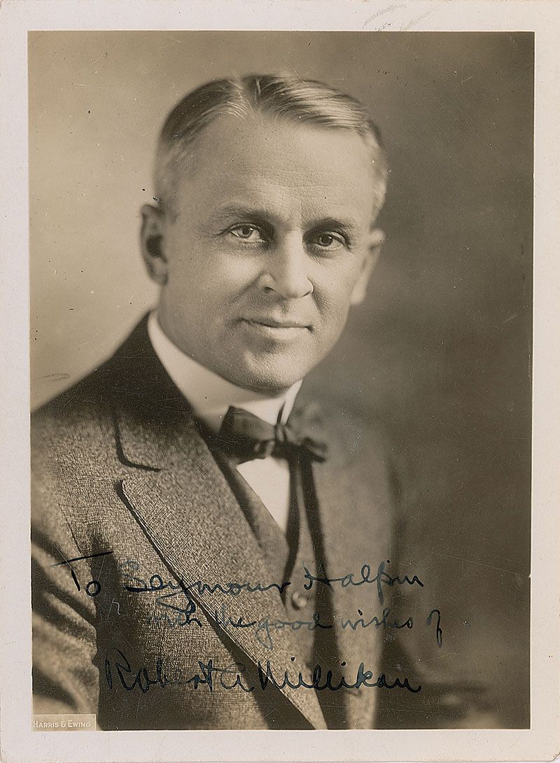 Nobel Prize–winning physicist (1868–1953) who was the first to isolate the electron and measure its charge. Vintage glossy 4 x 5.5 bust-length portrait of Millikan in a suit and bow tie, signed and inscribed in fountain pen, “To Seymour Halpern, with the good wishes of Robert A. Millikan.” In fine condition, with a paperclip impression to the upper border. Halpern was a congressman from New York.