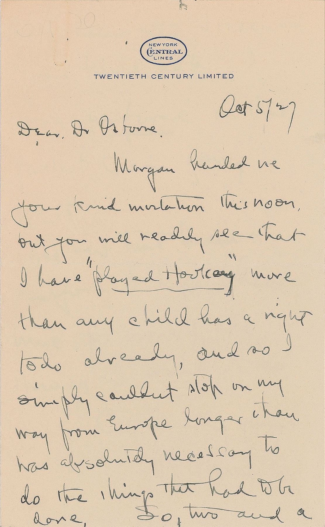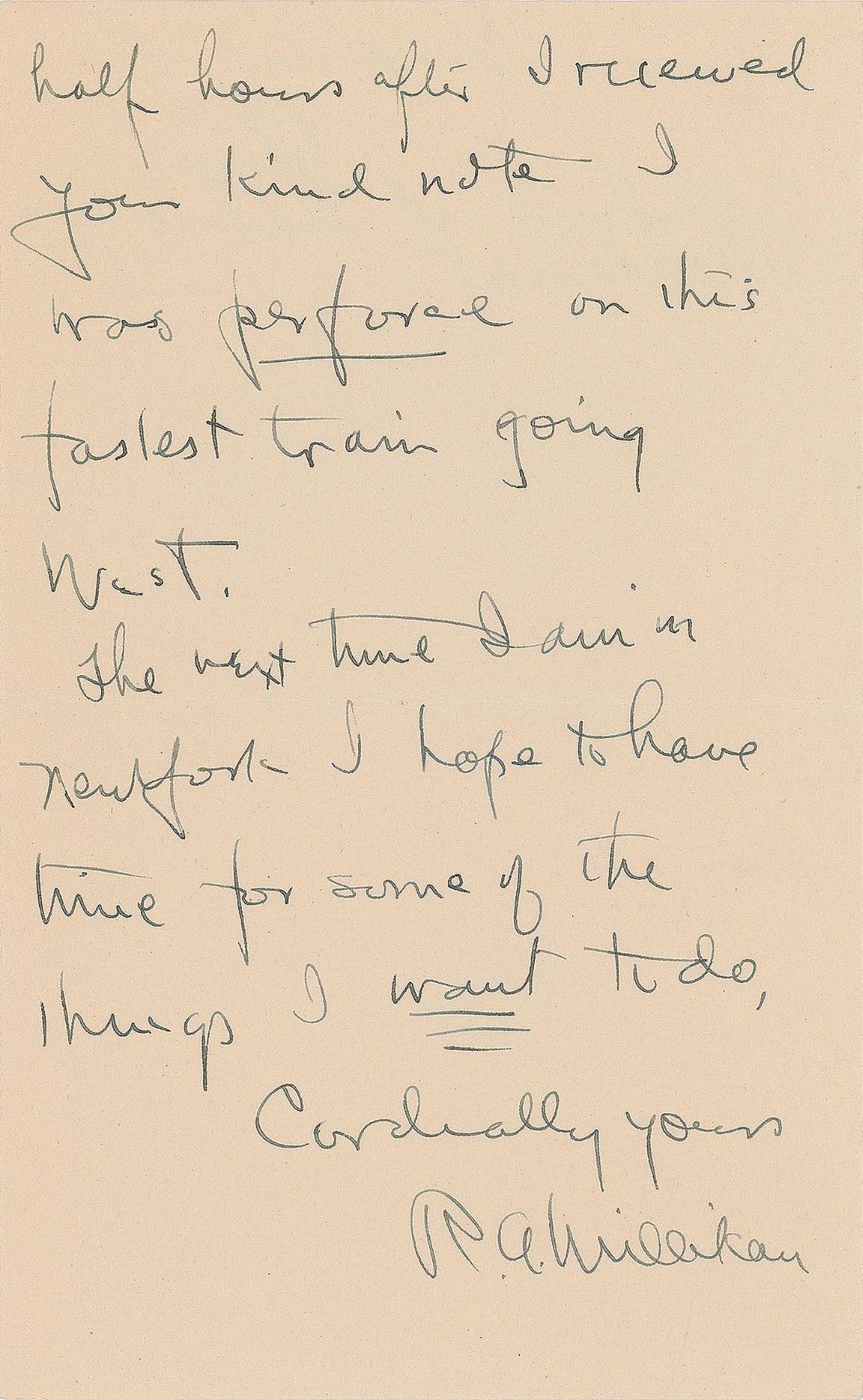 ALS signed “R. A. Millikan,” two pages on two adjoining sheets, 4.75 x 7.75, Twentieth Century Limited letterhead, October 5, 1927. Letter to Dr. Osborne, in full: "Morgan handed me your kind invitation this noon, but you will readily see that I have 'played Hookey' more than any child has a right to do already, and so I simply couldn't stop on my way from Europe longer than was absolutely necessary to do the things that had to be done. So, two and a half hours after I received your kind note I was perforce on this fastest train going West. The next time I am in New York I hope to have time for some of the things I want to do." In fine condition, with two paperclip impressions to the top edge.