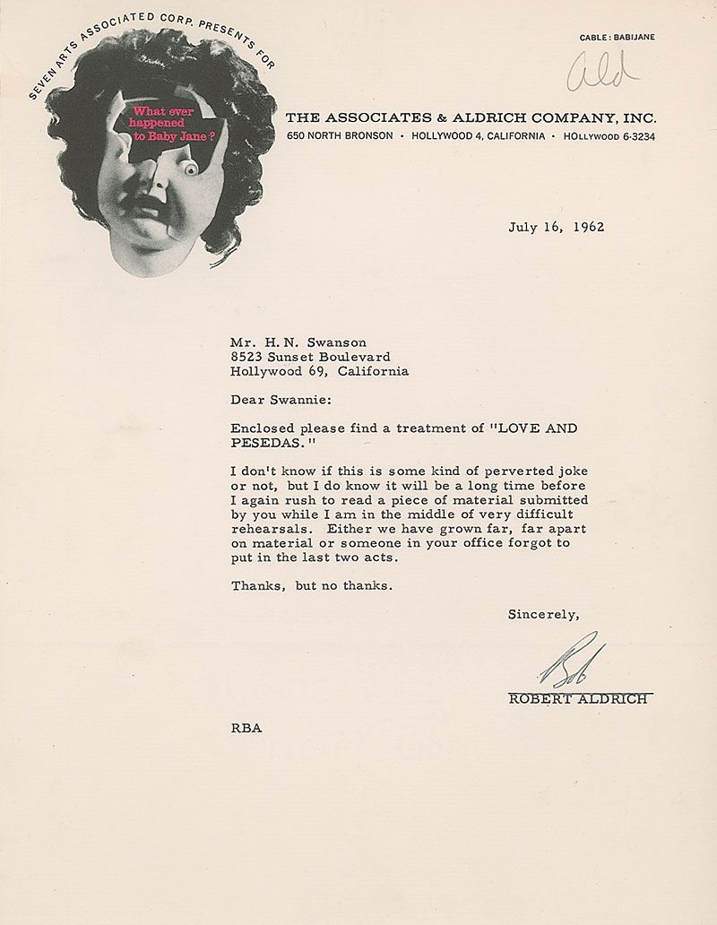 Noted film director (1918–1983) known for classics like The Dirty Dozen, What Ever Happened to Baby Jane?, and The Longest Yard. TLS signed “Bob,” one page, 8.5 x 11, The Associates & Aldrich Company letterhead, July 16, 1962. Letter to H. N. Swanson. In part: “Enclosed please find a treatment of ‘Love and Pesedas.’ I don’t know if this is some kind of perverted joke or not, but I do know it will be a long time before I again rush to read a piece of material submitted by you while I am in the middle of very difficult rehearsals. Either we have grown far, far apart on material or someone in your office forgot to put in the last two acts. Thanks but no thanks.” In fine condition.