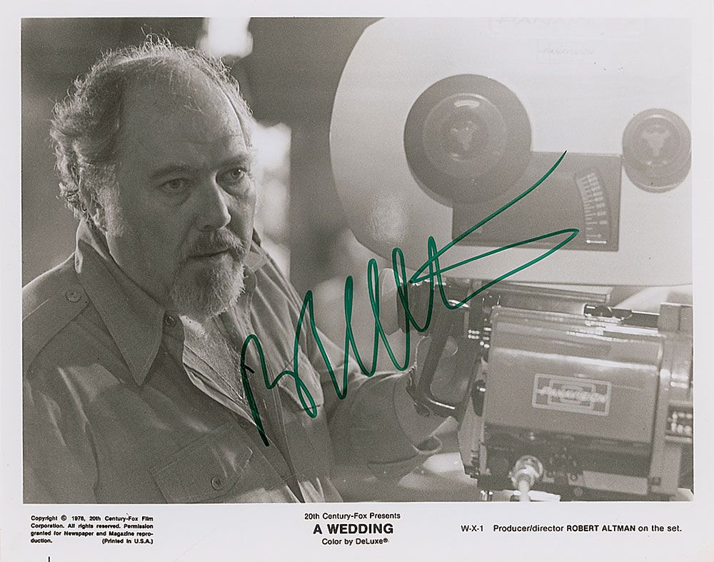 Glossy 10 x 8 promotional photo of Altman shooting A Wedding, signed in green felt tip. In fine condition.